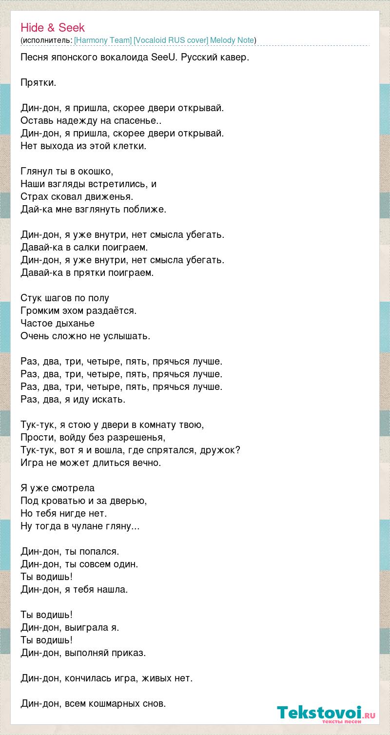 Песня японского вокалоида SeeU. Русский кавер. Прятки. Дин-дон, я пришла, скорее двери открывай. Оставь надежду на спасенье.. Дин-дон, я пришла, скорее двери открывай. Нет выхода из этой клетки. Глянул ты в окошко, Наши взгляды встретились, и Страх сковал движенья. Дай-ка мне взглянуть поближе. Дин-дон, я уже внутри, нет смысла убегать. Давай-ка в салки поиграем. Дин-дон, я уже внутри, нет смысла убегать. Давай-ка в прятки поиграем. Стук шагов по полу Громким эхом раздаётся. Частое дыханье Очень сложно не услышать. Раз, два, три, четыре, пять, прячься лучше. Раз, два, три, четыре, пять, прячься лучше. Раз, два, три, четыре, пять, прячься лучше. Раз, два, я иду искать. Тук-тук, я стою у двери в комнату твою, Прости, войду без разрешенья, Тук-тук, вот я и вошла, где спрятался, дружок? Игра не может длиться вечно. Я уже смотрела Под кроватью и за дверью, Но тебя нигде нет. Ну тогда в чулане гляну... Дин-дон, ты попался. Дин-дон, ты совсем один. Ты водишь! Дин-дон, я тебя нашла. Ты водишь! Дин-дон, выиграла я. Ты водишь! Дин-дон, выполняй приказ. Дин-дон, кончилась игра, живых нет. Дин-дон, всем кошмарных снов.