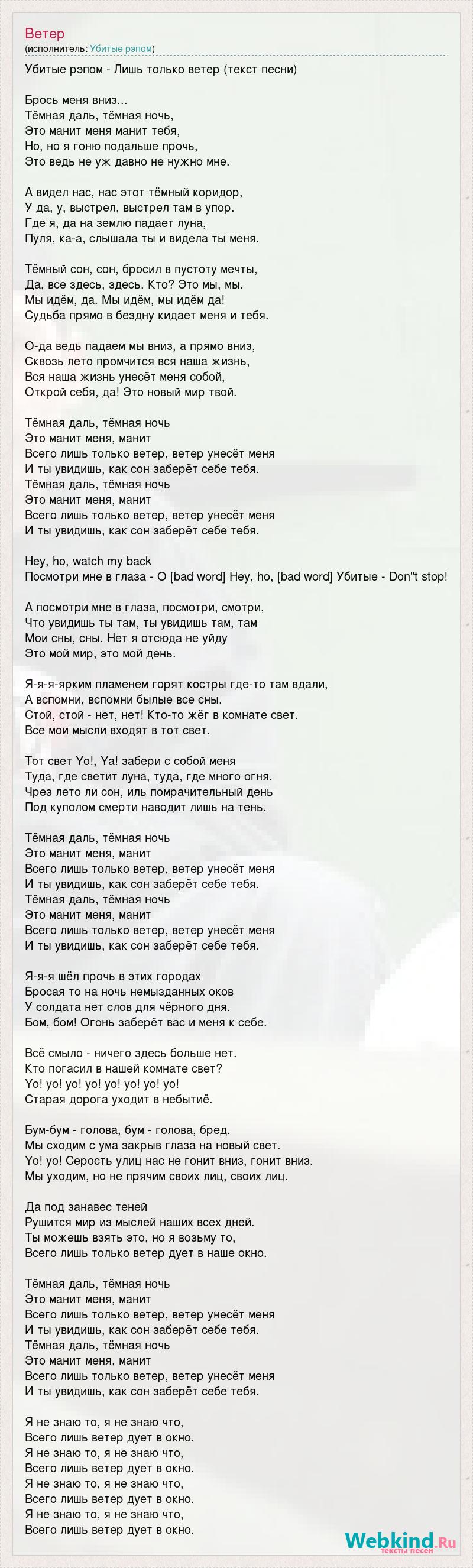 Убитые рэпом - Лишь только ветер (текст песни) Брось меня вниз... Тёмная даль, тёмная ночь, Это манит меня манит тебя, Но, но я гоню подальше прочь, Это ведь не уж давно не нужно мне. А видел нас, нас этот тёмный коридор, У да, у, выстрел, выстрел там в упор. Где я, да на землю падает луна, Пуля, ка-а, слышала ты и видела ты меня. Тёмный сон, сон, бросил в пустоту мечты, Да, все здесь, здесь. Кто? Это мы, мы. Мы идём, да. Мы идём, мы идём да! Судьба прямо в бездну кидает меня и тебя. О-да ведь падаем мы вниз, а прямо вниз, Сквозь лето промчится вся наша жизнь, Вся наша жизнь унесёт меня собой, Открой себя, да! Это новый мир твой. Тёмная даль, тёмная ночь Это манит меня, манит Всего лишь только ветер, ветер унесёт меня И ты увидишь, как сон заберёт себе тебя. Тёмная даль, тёмная ночь Это манит меня, манит Всего лишь только ветер, ветер унесёт меня И ты увидишь, как сон заберёт себе тебя. Hey, ho, watch my back Посмотри мне в глаза - О [bad word] Hey, ho, [bad word] Убитые - Don"t stop! А посмотри мне в глаза, посмотри, смотри, Что увидишь ты там, ты увидишь там, там Мои сны, сны. Нет я отсюда не уйду Это мой мир, это мой день. Я-я-я-ярким пламенем горят костры где-то там вдали, А вспомни, вспомни былые все сны. Стой, стой - нет, нет! Кто-то жёг в комнате свет. Все мои мысли входят в тот свет. Тот свет Yo!, Ya! забери с собой меня Туда, где светит луна, туда, где много огня. Чрез лето ли сон, иль помрачительный день Под куполом смерти наводит лишь на тень. Тёмная даль, тёмная ночь Это манит меня, манит Всего лишь только ветер, ветер унесёт меня И ты увидишь, как сон заберёт себе тебя. Тёмная даль, тёмная ночь Это манит меня, манит Всего лишь только ветер, ветер унесёт меня И ты увидишь, как сон заберёт себе тебя. Я-я-я шёл прочь в этих городах Бросая то на ночь немызданных оков У солдата нет слов для чёрного дня. Бом, бом! Огонь заберёт вас и меня к себе. Всё смыло - ничего здесь больше нет. Кто погасил в нашей комнате свет? Yo! yo! yo! yo! yo! yo! yo! yo! Старая дорога уходит в небытиё. Бум-бум - голова, бум - голова, бред. Мы сходим с ума закрыв глаза на новый свет. Yo! yo! Серость улиц нас не гонит вниз, гонит вниз. Мы уходим, но не прячим своих лиц, своих лиц. Да под занавес теней Рушится мир из мыслей наших всех дней. Ты можешь взять это, но я возьму то, Всего лишь только ветер дует в наше окно. Тёмная даль, тёмная ночь Это манит меня, манит Всего лишь только ветер, ветер унесёт меня И ты увидишь, как сон заберёт себе тебя. Тёмная даль, тёмная ночь Это манит меня, манит Всего лишь только ветер, ветер унесёт меня И ты увидишь, как сон заберёт себе тебя. Я не знаю то, я не знаю что, Всего лишь ветер дует в окно. Я не знаю то, я не знаю что, Всего лишь ветер дует в окно. Я не знаю то, я не знаю что, Всего лишь ветер дует в окно. Я не знаю то, я не знаю что, Всего лишь ветер дует в окно.