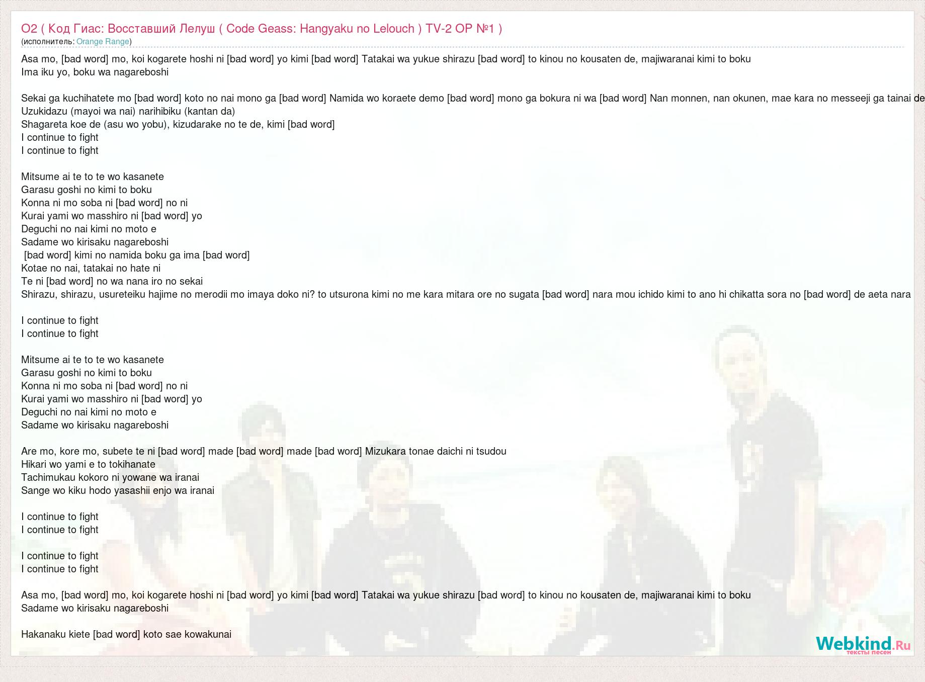 Главная→Исполнители→Orange Range→O2 ( Код Гиас: Восставший Лелуш ( Code Geass: Hangyaku no Lelouch ) TV-2 ОР
