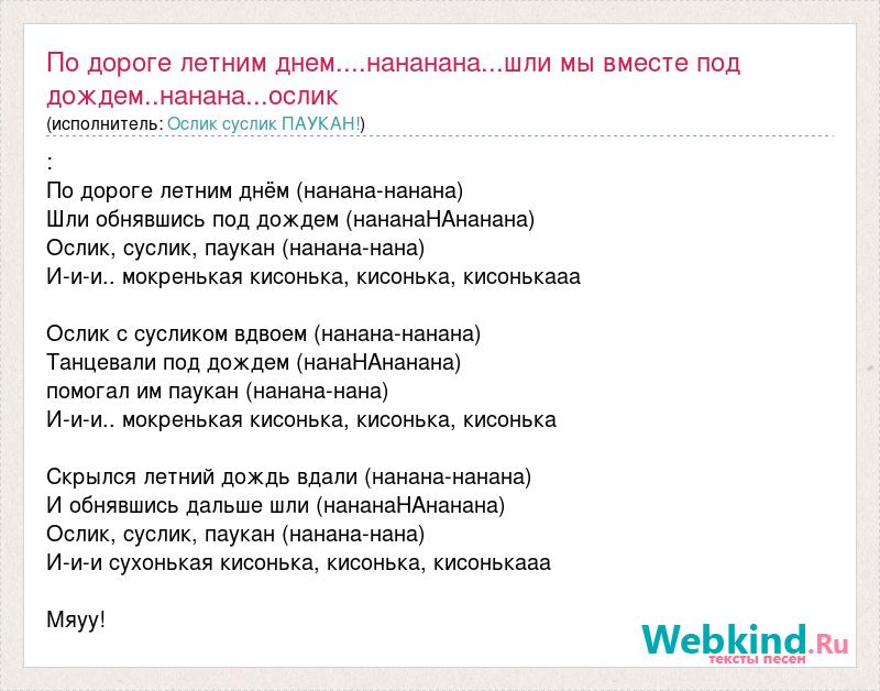 : По дороге летним днём (нанана-нанана) Шли обнявшись под дождем (нананаНАнанана) Ослик, суслик, паукан (нанана-нана) И-и-и.. мокренькая кисонька, кисонька, кисонькааа Ослик с сусликом вдвоем (нанана-нанана) Танцевали под дождем (нанаНАнанана) помогал им паукан (нанана-нана) И-и-и.. мокренькая кисонька, кисонька, кисонька Скрылся летний дождь вдали (нанана-нанана) И обнявшись дальше шли (нананаНАнанана) Ослик, суслик, паукан (нанана-нана) И-и-и сухонькая кисонька, кисонька, кисонькааа Мяуу!