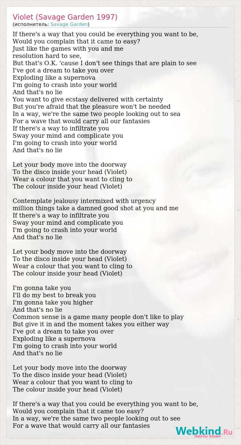 А как ты думаешь, о чем песня "Violet (Savage Garden 1997)" ?