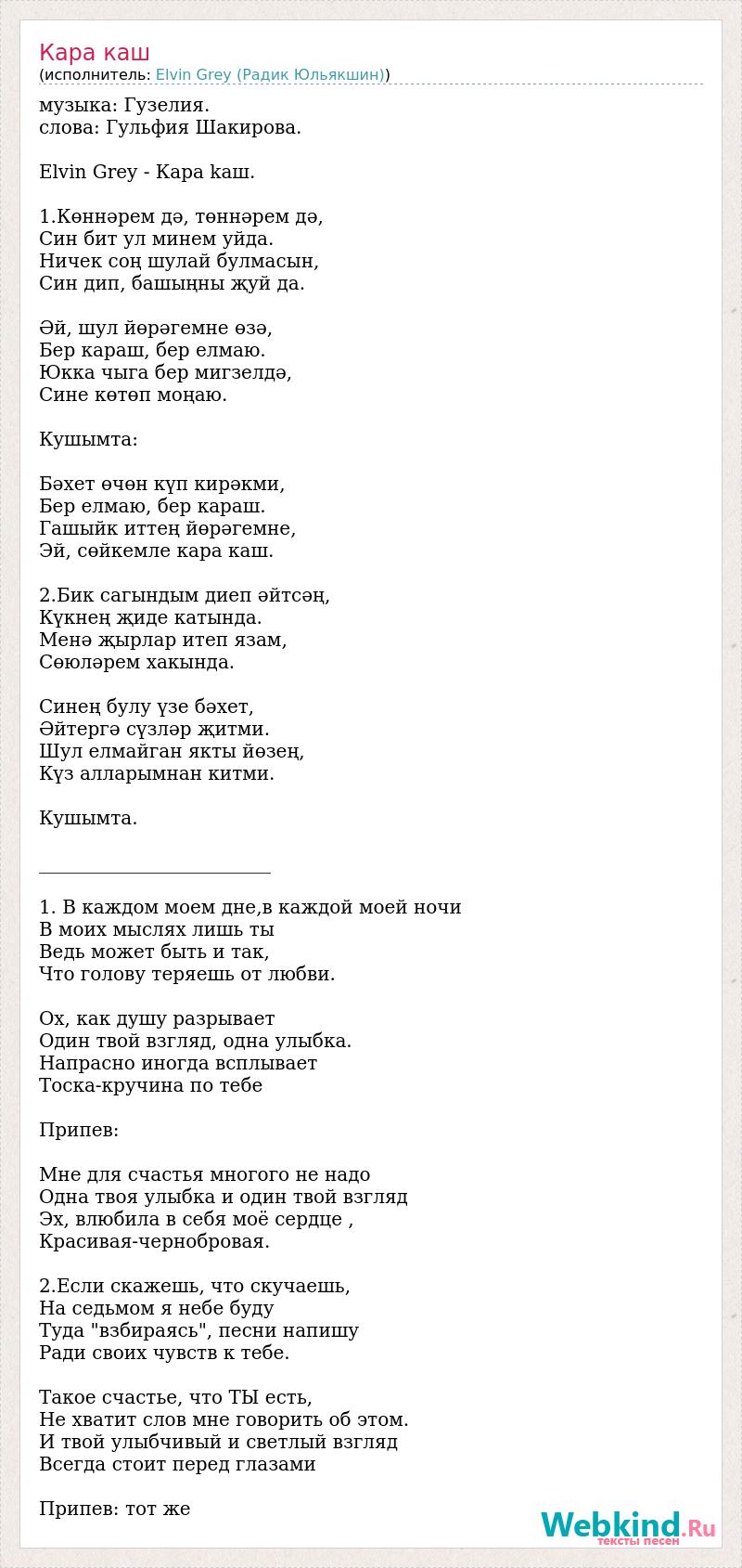 музыка: Гузелия. слова: Гульфия Шакирова. Elvin Grey - Кара kаш. 1.Көннәрем дә, төннәрем дә, Син бит ул минем уйда. Ничек соң шулай булмасын, Син дип, башыңны җуй да. Әй, шул йөрәгемне өзә, Бер караш, бер елмаю. Юкка чыга бер мигзелдә, Сине көтөп моңаю. Кушымта: Бәхет өчөн күп кирәкми, Бер елмаю, бер караш. Гашыйк иттең йөрәгемне, Эй, сөйкемле кара каш. 2.Бик сагындым диеп әйтсәң, Күкнең җиде катында. Менә җырлар итеп язам, Сөюләрем хакында. Синең булу үзе бәхет, Әйтергә сүзләр җитми. Шул елмайган якты йөзең, Күз алларымнан китми. Кушымта. _________________________ 1. В каждом моем дне,в каждой моей ночи В моих мыслях лишь ты Ведь может быть и так, Что голову теряешь от любви. Ох, как душу разрывает Один твой взгляд, одна улыбка. Напрасно иногда всплывает Тоска-кручина по тебе Припев: Мне для счастья многого не надо Одна твоя улыбка и один твой взгляд Эх, влюбила в себя моё сердце , Красивая-чернобровая. 2.Если скажешь, что скучаешь, На седьмом я небе буду Туда "взбираясь", песни напишу Ради своих чувств к тебе. Такое счастье, что ТЫ есть, Не хватит слов мне говорить об этом. И твой улыбчивый и светлый взгляд Всегда стоит перед глазами Припев: тот же