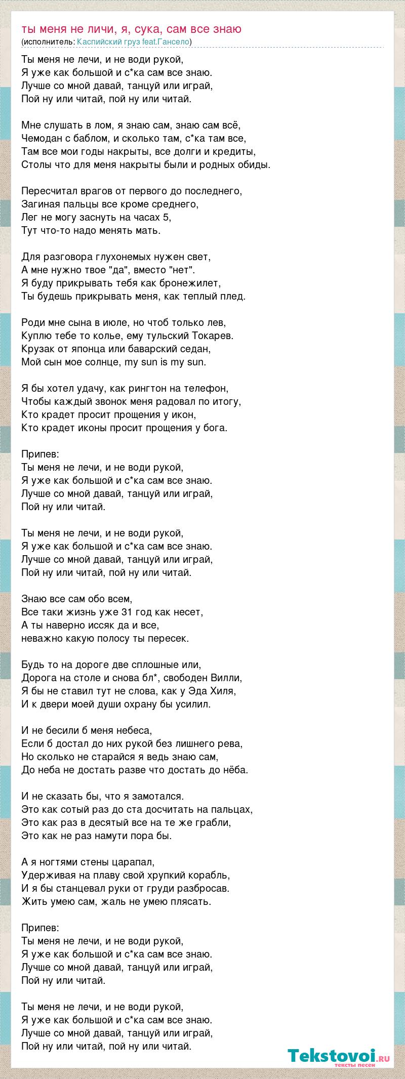 Ты меня не лечи, и не води рукой, Я уже как большой и с*ка сам все знаю. Лучше со мной давай, танцуй или играй, Пой ну или читай, пой ну или читай. Мне слушать в лом, я знаю сам, знаю сам всё, Чемодан с баблом, и сколько там, с*ка там все, Там все мои годы накрыты, все долги и кредиты, Столы что для меня накрыты были и родных обиды. Пересчитал врагов от первого до последнего, Загиная пальцы все кроме среднего, Лег не могу заснуть на часах 5, Тут что-то надо менять мать. Для разговора глухонемых нужен свет, А мне нужно твое "да", вместо "нет". Я буду прикрывать тебя как бронежилет, Ты будешь прикрывать меня, как теплый плед. Роди мне сына в июле, но чтоб только лев, Куплю тебе то колье, ему тульский Токарев. Крузак от японца или баварский седан, Мой сын мое солнце, my sun is my sun. Я бы хотел удачу, как рингтон на телефон, Чтобы каждый звонок меня радовал по итогу, Кто крадет просит прощения у икон, Кто крадет иконы просит прощения у бога. Припев: Ты меня не лечи, и не води рукой, Я уже как большой и с*ка сам все знаю. Лучше со мной давай, танцуй или играй, Пой ну или читай. Ты меня не лечи, и не води рукой, Я уже как большой и с*ка сам все знаю. Лучше со мной давай, танцуй или играй, Пой ну или читай, пой ну или читай. Знаю все сам обо всем, Все таки жизнь уже 31 год как несет, А ты наверно иссяк да и все, неважно какую полосу ты пересек. Будь то на дороге две сплошные или, Дорога на столе и снова бл*, свободен Вилли, Я бы не ставил тут не слова, как у Эда Хиля, И к двери моей души охрану бы усилил. И не бесили б меня небеса, Если б достал до них рукой без лишнего рева, Но сколько не старайся я ведь знаю сам, До неба не достать разве что достать до нёба. И не сказать бы, что я замотался. Это как сотый раз до ста досчитать на пальцах, Это как раз в десятый все на те же грабли, Это как не раз намути пора бы. А я ногтями стены царапал, Удерживая на плаву свой хрупкий корабль, И я бы станцевал руки от груди разбросав. Жить умею сам, жаль не умею плясать. Припев: Ты меня не лечи, и не води рукой, Я уже как большой и с*ка сам все знаю. Лучше со мной давай, танцуй или играй, Пой ну или читай. Ты меня не лечи, и не води рукой, Я уже как большой и с*ка сам все знаю. Лучше со мной давай, танцуй или играй, Пой ну или читай, пой ну или читай.