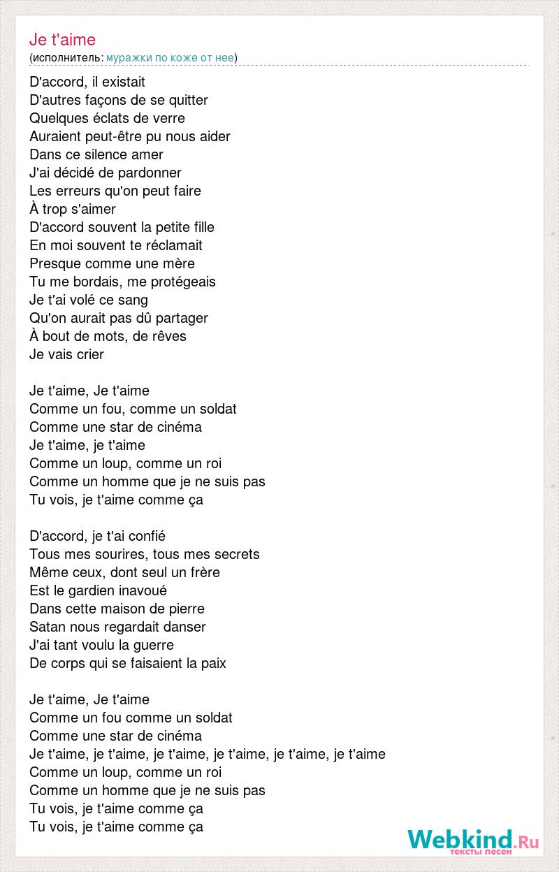 D'accord, il existait D'autres façons de se quitter Quelques éclats de verre Auraient peut-être pu nous aider Dans ce silence amer J'ai décidé de pardonner Les erreurs qu'on peut faire À trop s'aimer D'accord souvent la petite fille En moi souvent te réclamait Presque comme une mère Tu me bordais, me protégeais Je t'ai volé ce sang Qu'on aurait pas dû partager À bout de mots, de rêves Je vais crier Je t'aime, Je t'aime Comme un fou, comme un soldat Comme une star de cinéma Je t'aime, je t'aime Comme un loup, comme un roi Comme un homme que je ne suis pas Tu vois, je t'aime comme ça D'accord, je t'ai confié Tous mes sourires, tous mes secrets Même ceux, dont seul un frère Est le gardien inavoué Dans cette maison de pierre Satan nous regardait danser J'ai tant voulu la guerre De corps qui se faisaient la paix Je t'aime, Je t'aime Comme un fou comme un soldat Comme une star de cinéma Je t'aime, je t'aime, je t'aime, je t'aime, je t'aime, je t'aime Comme un loup, comme un roi Comme un homme que je ne suis pas Tu vois, je t'aime comme ça Tu vois, je t'aime comme ça