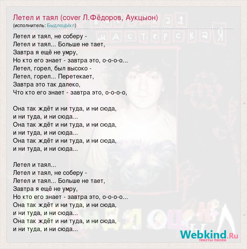 Летел и таял, не соберу - Летел и таял... Больше не тает, Завтра я ещё не умру, Но кто его знает - завтра это, о-о-о-о... Летел, горел, был высоко - Летел, горел... Перетекает, Завтра это так далеко, Что кто его знает - завтра это, о-о-о-о, Она так ждёт и ни туда, и ни сюда, и ни туда, и ни сюда... Она так ждёт и ни туда, и ни сюда, и ни туда, и ни сюда... Она так ждёт и ни туда, и ни сюда, и ни туда, и ни сюда... Летел и таял... Летел и таял, не соберу - Летел и таял... Больше не тает, Завтра я ещё не умру, Но кто его знает - завтра это, о-о-о-о... Она так ждёт и ни туда, и ни сюда, и ни туда, и ни сюда... Она так ждёт и ни туда, и ни сюда, и ни туда, и ни сюда...