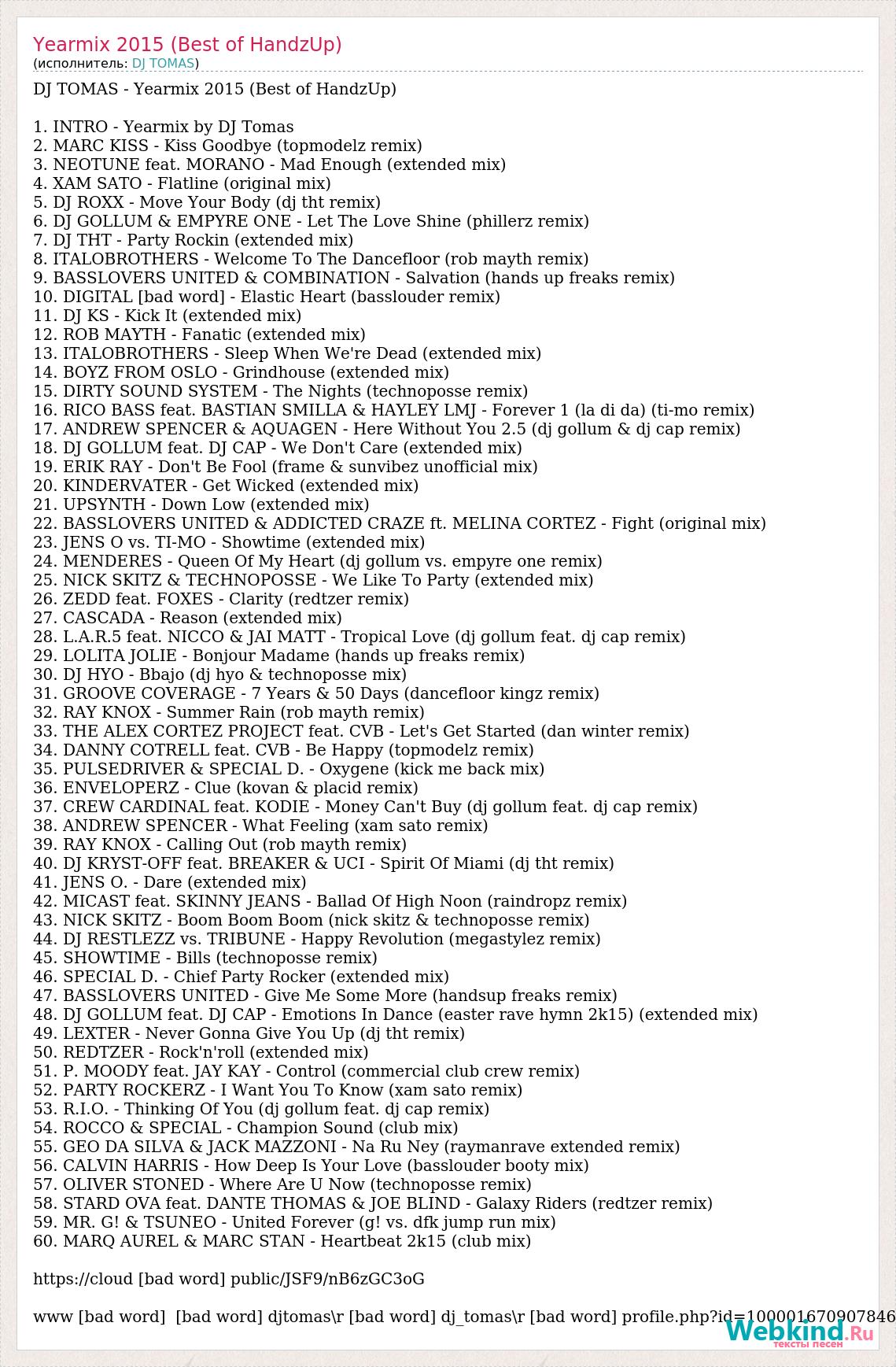DJ TOMAS - Yearmix 2015 (Best of HandzUp) 1. INTRO - Yearmix by DJ Tomas 2. MARC KISS - Kiss Goodbye (topmodelz remix) 3. NEOTUNE feat. MORANO - Mad Enough (extended mix) 4. XAM SATO - Flatline (original mix) 5. DJ ROXX - Move Your Body (dj tht remix) 6. DJ GOLLUM & EMPYRE ONE - Let The Love Shine (phillerz remix) 7. DJ THT - Party Rockin (extended mix) 8. ITALOBROTHERS - Welcome To The Dancefloor (rob mayth remix) 9. BASSLOVERS UNITED & COMBINATION - Salvation (hands up freaks remix) 10. DIGITAL [bad word] - Elastic Heart (basslouder remix) 11. DJ KS - Kick It (extended mix) 12. ROB MAYTH - Fanatic (extended mix) 13. ITALOBROTHERS - Sleep When We're Dead (extended mix) 14. BOYZ FROM OSLO - Grindhouse (extended mix) 15. DIRTY SOUND SYSTEM - The Nights (technoposse remix) 16. RICO BASS feat. BASTIAN SMILLA & HAYLEY LMJ - Forever 1 (la di da) (ti-mo remix) 17. ANDREW SPENCER & AQUAGEN - Here Without You 2.5 (dj gollum & dj cap remix) 18. DJ GOLLUM feat. DJ CAP - We Don't Care (extended mix) 19. ERIK RAY - Don't Be Fool (frame & sunvibez unofficial mix) 20. KINDERVATER - Get Wicked (extended mix) 21. UPSYNTH - Down Low (extended mix) 22. BASSLOVERS UNITED & ADDICTED CRAZE ft. MELINA CORTEZ - Fight (original mix) 23. JENS O vs. TI-MO - Showtime (extended mix) 24. MENDERES - Queen Of My Heart (dj gollum vs. empyre one remix) 25. NICK SKITZ & TECHNOPOSSE - We Like To Party (extended mix) 26. ZEDD feat. FOXES - Clarity (redtzer remix) 27. CASCADA - Reason (extended mix) 28. L.A.R.5 feat. NICCO & JAI MATT - Tropical Love (dj gollum feat. dj cap remix) 29. LOLITA JOLIE - Bonjour Madame (hands up freaks remix) 30. DJ HYO - Bbajo (dj hyo & technoposse mix) 31. GROOVE COVERAGE - 7 Years & 50 Days (dancefloor kingz remix) 32. RAY KNOX - Summer Rain (rob mayth remix) 33. THE ALEX CORTEZ PROJECT feat. CVB - Let's Get Started (dan winter remix) 34. DANNY COTRELL feat. CVB - Be Happy (topmodelz remix) 35. PULSEDRIVER & SPECIAL D. - Oxygene (kick me back mix) 36. ENVELOPERZ - Clue (kovan & placid remix) 37. CREW CARDINAL feat. KODIE - Money Can't Buy (dj gollum feat. dj cap remix) 38. ANDREW SPENCER - What Feeling (xam sato remix) 39. RAY KNOX - Calling Out (rob mayth remix) 40. DJ KRYST-OFF feat. BREAKER & UCI - Spirit Of Miami (dj tht remix) 41. JENS O. - Dare (extended mix) 42. MICAST feat. SKINNY JEANS - Ballad Of High Noon (raindropz remix) 43. NICK SKITZ - Boom Boom Boom (nick skitz & technoposse remix) 44. DJ RESTLEZZ vs. TRIBUNE - Happy Revolution (megastylez remix) 45. SHOWTIME - Bills (technoposse remix) 46. SPECIAL D. - Chief Party Rocker (extended mix) 47. BASSLOVERS UNITED - Give Me Some More (handsup freaks remix) 48. DJ GOLLUM feat. DJ CAP - Emotions In Dance (easter rave hymn 2k15) (extended mix) 49. LEXTER - Never Gonna Give You Up (dj tht remix) 50. REDTZER - Rock'n'roll (extended mix) 51. P. MOODY feat. JAY KAY - Control (commercial club crew remix) 52. PARTY ROCKERZ - I Want You To Know (xam sato remix) 53. R.I.O. - Thinking Of You (dj gollum feat. dj cap remix) 54. ROCCO & SPECIAL - Champion Sound (club mix) 55. GEO DA SILVA & JACK MAZZONI - Na Ru Ney (raymanrave extended remix) 56. CALVIN HARRIS - How Deep Is Your Love (basslouder booty mix) 57. OLIVER STONED - Where Are U Now (technoposse remix) 58. STARD OVA feat. DANTE THOMAS & JOE BLIND - Galaxy Riders (redtzer remix) 59. MR. G! & TSUNEO - United Forever (g! vs. dfk jump run mix) 60. MARQ AUREL & MARC STAN - Heartbeat 2k15 (club mix) https://cloud [bad word] public/JSF9/nB6zGC3oG www [bad word] [bad word] djtomas\r [bad word] dj_tomas\r [bad word] profile.php?id=100001670907846