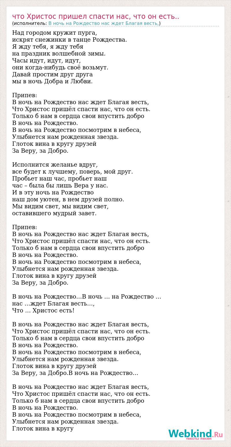 Над городом кружит пурга, искрят снежинки в танце Рождества. Я жду тебя, я жду тебя на праздник волшебной зимы. Часы идут, идут, идут, они когда-нибудь своё возьмут. Давай простим друг друга мы в ночь Добра и Любви. Припев: В ночь на Рождество нас ждет Благая весть, Что Христос пришёл спасти нас, что он есть. Только б нам в сердца свои впустить добро В ночь на Рождество. В ночь на Рождество посмотрим в небеса, Улыбнется нам рожденная звезда. Глоток вина в кругу друзей За Веру, за Добро. Исполнится желанье вдруг, все будет к лучшему, поверь, мой друг. Пробьет наш час, пробьет наш час – была бы лишь Вера у нас. И в эту ночь на Рождество наш дом уютен, в нем друзей полно. Мы видим свет, мы видим свет, оставившего мудрый завет. Припев: В ночь на Рождество нас ждет Благая весть, Что Христос пришёл спасти нас, что он есть. Только б нам в сердца свои впустить добро В ночь на Рождество. В ночь на Рождество посмотрим в небеса, Улыбнется нам рожденная звезда. Глоток вина в кругу друзей За Веру, за Добро. В ночь на Рождество…В ночь … на Рождество … нас …ждет Благая весть…, Что … Христос есть! В ночь на Рождество нас ждет Благая весть, Что Христос пришёл спасти нас, что он есть. Только б нам в сердца свои впустить добро В ночь на Рождество. В ночь на Рождество посмотрим в небеса, Улыбнется нам рожденная звезда. Глоток вина в кругу друзей За Веру, за Добро.В ночь на Рождество… В ночь на Рождество нас ждет Благая весть, Что Христос пришёл спасти нас, что он есть. Только б нам в сердца свои впустить добро В ночь на Рождество. В ночь на Рождество посмотрим в небеса, Улыбнется нам рожденная звезда. Глоток вина в кругу