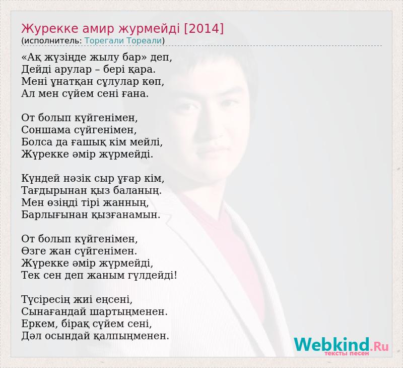 «Ақ жүзіңде жылу бар» деп, Дейді арулар – бері қара. Мені ұнатқан сұлулар көп, Ал мен сүйем сені ғана. От болып күйгенімен, Соншама сүйгенімен, Болса да ғашық кім мейлі, Жүрекке әмір жүрмейді. Күндей нәзік сыр ұғар кім, Тағдырынан қыз баланың. Мен өзіңді тірі жанның, Барлығынан қызғанамын. От болып күйгенімен, Өзге жан сүйгенімен. Жүрекке әмір жүрмейді, Тек сен деп жаным гүлдейді! Түсіресің жиі еңсені, Сынағандай шартыңменен. Еркем, бірақ сүйем сені, Дәл осындай қалпыңменен.