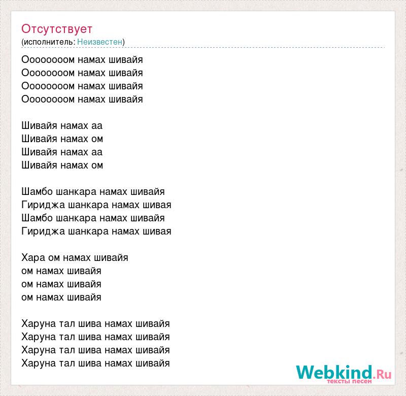 Оооооооом намах шивайя Оооооооом намах шивайя Оооооооом намах шивайя Оооооооом намах шивайя Шивайя намах аа Шивайя намах ом Шивайя намах аа Шивайя намах ом Шамбо шанкара намах шивайя Гириджа шанкара намах шивая Шамбо шанкара намах шивайя Гириджа шанкара намах шивая Хара ом намах шивайя ом намах шивайя ом намах шивайя ом намах шивайя Харуна тал шива намах шивайя Харуна тал шива намах шивайя Харуна тал шива намах шивайя Харуна тал шива намах шивайя