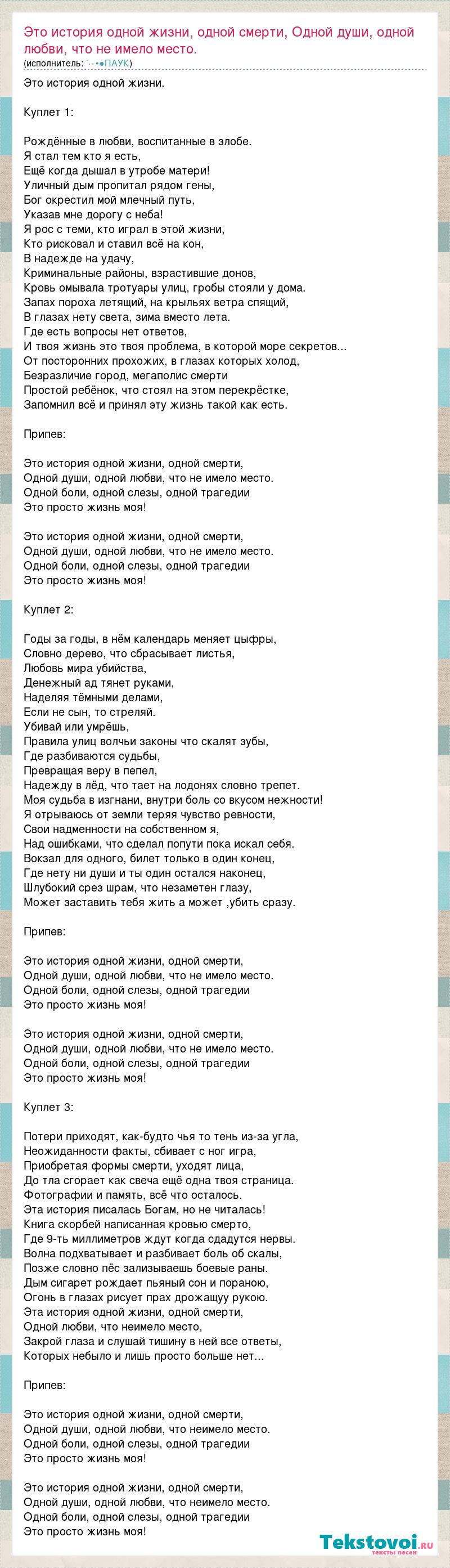 Это история одной жизни. Куплет 1: Рождённые в любви, воспитанные в злобе. Я стал тем кто я есть, Ещё когда дышал в утробе матери! Уличный дым пропитал рядом гены, Бог окрестил мой млечный путь, Указав мне дорогу с неба! Я рос с теми, кто играл в этой жизни, Кто рисковал и ставил всё на кон, В надежде на удачу, Криминальные районы, взрастившие донов, Кровь омывала тротуары улиц, гробы стояли у дома. Запах пороха летящий, на крыльях ветра спящий, В глазах нету света, зима вместо лета. Где есть вопросы нет ответов, И твоя жизнь это твоя проблема, в которой море секретов... От посторонних прохожих, в глазах которых холод, Безразличие город, мегаполис смерти Простой ребёнок, что стоял на этом перекрёстке, Запомнил всё и принял эту жизнь такой как есть. Припев: Это история одной жизни, одной смерти, Одной души, одной любви, что не имело место. Одной боли, одной слезы, одной трагедии Это просто жизнь моя! Это история одной жизни, одной смерти, Одной души, одной любви, что не имело место. Одной боли, одной слезы, одной трагедии Это просто жизнь моя! Куплет 2: Годы за годы, в нём календарь меняет цыфры, Словно дерево, что сбрасывает листья, Любовь мира убийства, Денежный ад тянет руками, Наделяя тёмными делами, Если не сын, то стреляй. Убивай или умрёшь, Правила улиц волчьи законы что скалят зубы, Где разбиваются судьбы, Превращая веру в пепел, Надежду в лёд, что тает на лодонях словно трепет. Моя судьба в изгнани, внутри боль со вкусом нежности! Я отрываюсь от земли теряя чувство ревности, Свои надменности на собственном я, Над ошибками, что сделал попути пока искал себя. Вокзал для одного, билет только в один конец, Где нету ни души и ты один остался наконец, Шлубокий срез шрам, что незаметен глазу, Может заставить тебя жить а может ,убить сразу. Припев: Это история одной жизни, одной смерти, Одной души, одной любви, что не имело место. Одной боли, одной слезы, одной трагедии Это просто жизнь моя! Это история одной жизни, одной смерти, Одной души, одной любви, что не имело место. Одной боли, одной слезы, одной трагедии Это просто жизнь моя! Куплет 3: Потери приходят, как-будто чья то тень из-за угла, Неожиданности факты, сбивает с ног игра, Приобретая формы смерти, уходят лица, До тла сгорает как свеча ещё одна твоя страница. Фотографии и память, всё что осталось. Эта история писалась Богам, но не читалась! Книга скорбей написанная кровью смерто, Где 9-ть миллиметров ждут когда сдадутся нервы. Волна подхватывает и разбивает боль об скалы, Позже словно пёс зализываешь боевые раны. Дым сигарет рождает пьяный сон и пораною, Огонь в глазах рисует прах дрожащуу рукою. Эта история одной жизни, одной смерти, Одной любви, что неимело место, Закрой глаза и слушай тишину в ней все ответы, Которых небыло и лишь просто больше нет... Припев: Это история одной жизни, одной смерти, Одной души, одной любви, что неимело место. Одной боли, одной слезы, одной трагедии Это просто жизнь моя! Это история одной жизни, одной смерти, Одной души, одной любви, что неимело место. Одной боли, одной слезы, одной трагедии Это просто жизнь моя!