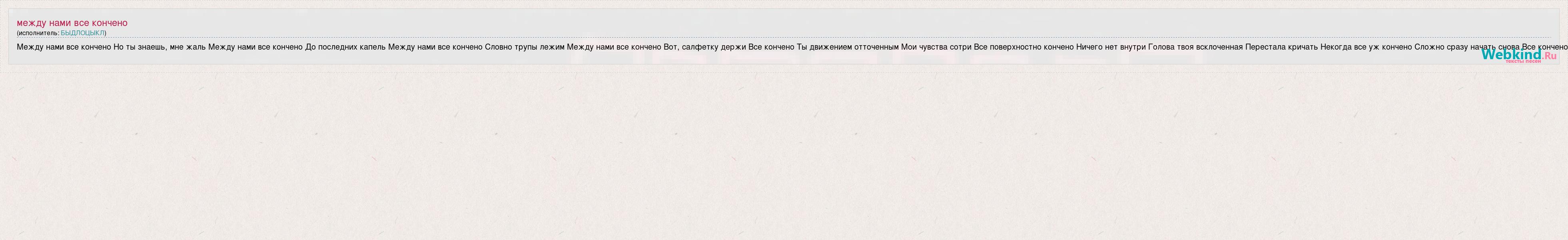 Между нами все кончено Но ты знаешь, мне жаль Между нами все кончено До последних капель Между нами все кончено Словно трупы лежим Между нами все кончено Вот, салфетку держи Все кончено Ты движением отточенным Мои чувства сотри Все поверхностно кончено Ничего нет внутри Голова твоя всклоченная Перестала кричать Некогда все уж кончено Сложно сразу начать снова Все кончено