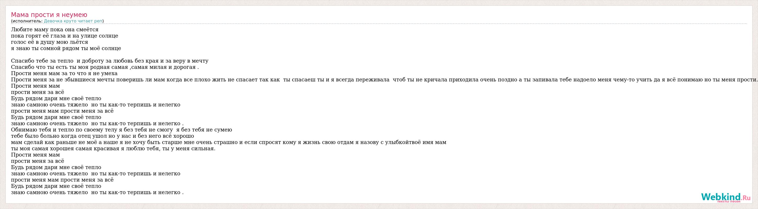 Любите маму пока она смеётся пока горят её глаза и на улице солнце голос её в душу мою льётся я знаю ты сомной рядом ты моё солнце Спасибо тебе за тепло и доброту за любовь без края и за веру в мечту Спасибо что ты есть ты моя родная самая ,самая милая и дорогая . Прости меня мам за то что я не умеха Прости меня за не збывшиеся мечты поверишь ли мам когда все плохо жить не спасает так как ты спасаеш ты и я всегда переживала чтоб ты не кричала приходила очень поздно а ты запивала тебе надоело меня чему-то учить да я всё понимаю но ты меня прости. Прости меня мам прости меня за всё Будь рядом дари мне своё тепло знаю самною очень тяжело но ты как-то терпишь и нелегко прости меня мам прости меня за всё Будь рядом дари мне своё тепло знаю самною очень тяжело но ты как-то терпишь и нелегко . Обнимаю тебя и тепло по своему телу я без тебя не смогу я без тебя не сумею тебе было больно когда отец ушол но у нас и без него всё хорошо мам сделай как раньше не моё а наше я не хочу быть старше мне очень страшно и если спросят кому я жизнь свою отдам я назову с улыбкойтвоё имя мам ты моя самая хорошея самая красивая я люблю тебя, ты у меня сильная. Прости меня мам прости меня за всё Будь рядом дари мне своё тепло знаю самною очень тяжело но ты как-то терпишь и нелегко прости меня мам прости меня за всё Будь рядом дари мне своё тепло знаю самною очень тяжело но ты как-то терпишь и нелегко .