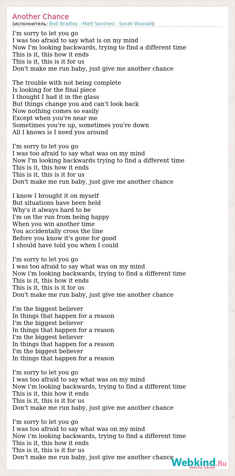 I'm sorry to let you go I was too afraid to say what is on my mind Now I'm looking backwards, trying to find a different time This is it, this how it ends This is it, this is it for us Don't make me run baby, just give me another chance The trouble with not being complete Is looking for the final piece I thought I had it in the glass But things change you and can't look back Now nothing comes so easily Except when you're near me Sometimes you're up, sometimes you're down All I knows is I need you around I'm sorry to let you go I was too afraid to say what was on my mind Now I'm looking backwards trying to find a different time This is it, this how it ends This is it, this is it for us Don't make me run baby, just give me another chance I know I brought it on myself But situations have been held Why's it always hard to be I'm on the run from being happy When you win another time You accidentally cross the line Before you know it's gone for good I should have told you when I could I'm sorry to let you go I was too afraid to say what was on my mind Now i'm looking backwards, trying to find a different time This is it, this how it ends This is it, this is it for us Don't make me run baby, just give me another chance I'm the biggest believer In things that happen for a reason I'm the biggest believer In things that happen for a reason I'm the biggest believer In things that happen for a reason I'm the biggest believer In things that happen for a reason I'm sorry to let you go I was too afraid to say what was on my mind Now i'm looking backwards, trying to find a different time This is it, this how it ends This is it, this is it for us Don't make me run baby, just give me another chance I'm sorry to let you go I was too afraid to say what was on my mind Now i'm looking backwards, trying to find a different time This is it, this how it ends This is it, this is it for us Don't make me run baby, just give me another chance