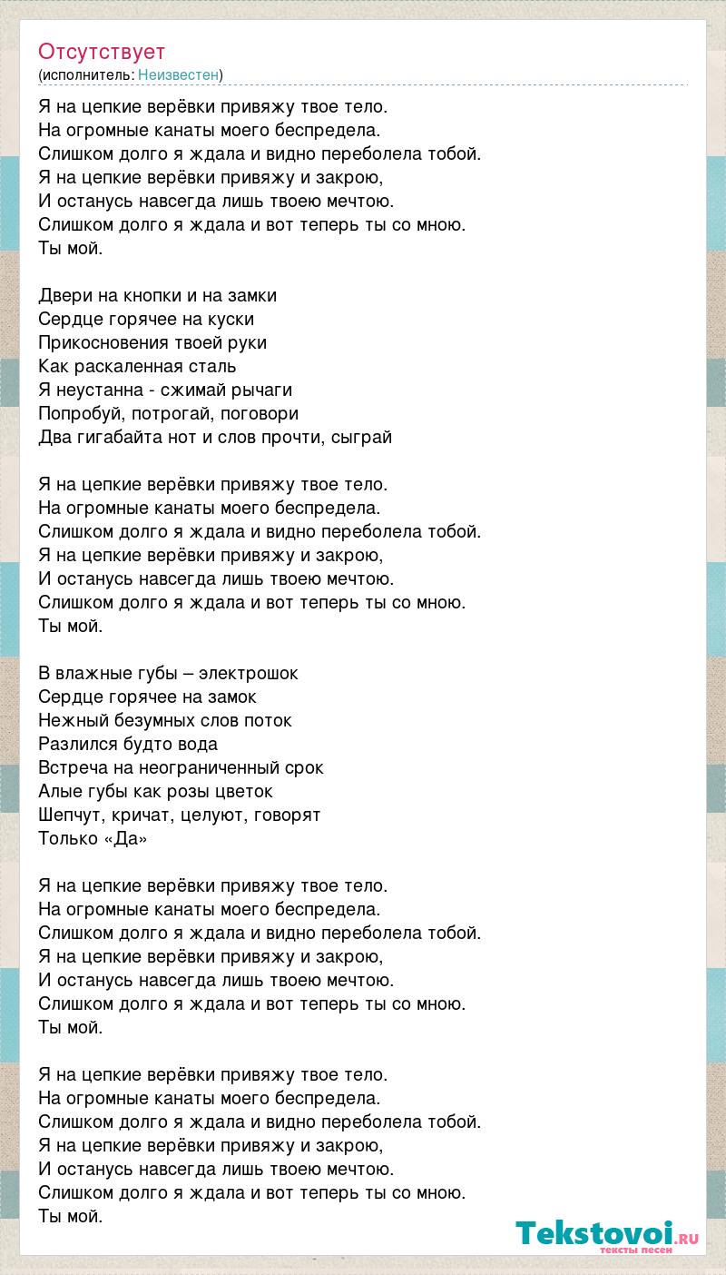 Я на цепкие верёвки привяжу твое тело. На огромные канаты моего беспредела. Слишком долго я ждала и видно переболела тобой. Я на цепкие верёвки привяжу и закрою, И останусь навсегда лишь твоею мечтою. Слишком долго я ждала и вот теперь ты со мною. Ты мой. Двери на кнопки и на замки Сердце горячее на куски Прикосновения твоей руки Как раскаленная сталь Я неустанна - сжимай рычаги Попробуй, потрогай, поговори Два гигабайта нот и слов прочти, сыграй Я на цепкие верёвки привяжу твое тело. На огромные канаты моего беспредела. Слишком долго я ждала и видно переболела тобой. Я на цепкие верёвки привяжу и закрою, И останусь навсегда лишь твоею мечтою. Слишком долго я ждала и вот теперь ты со мною. Ты мой. В влажные губы – электрошок Сердце горячее на замок Нежный безумных слов поток Разлился будто вода Встреча на неограниченный срок Алые губы как розы цветок Шепчут, кричат, целуют, говорят Только «Да» Я на цепкие верёвки привяжу твое тело. На огромные канаты моего беспредела. Слишком долго я ждала и видно переболела тобой. Я на цепкие верёвки привяжу и закрою, И останусь навсегда лишь твоею мечтою. Слишком долго я ждала и вот теперь ты со мною. Ты мой. Я на цепкие верёвки привяжу твое тело. На огромные канаты моего беспредела. Слишком долго я ждала и видно переболела тобой. Я на цепкие верёвки привяжу и закрою, И останусь навсегда лишь твоею мечтою. Слишком долго я ждала и вот теперь ты со мною. Ты мой.