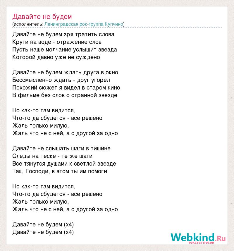 Давайте не будем зря тратить слова Круги на воде - отражение слов Пусть наше молчание услышит звезда Которой давно уже не суждено Давайте не будем ждать друга в окно Бессмысленно ждать - друг угорел Похожий сюжет я видел в старом кино В фильме без слов о странной звезде Но как-то там видится, Что-то да сбудется - все решено Жаль только милую, Жаль что не с ней, а с другой за одно Давайте не слышать шаги в тишине Следы на песке - те же шаги Все тянутся душами к светлой звезде Так, Господи, в этом ты им помоги Но как-то там видится, Что-то да сбудется - все решено Жаль только милую, Жаль что не с ней, а с другой за одно Давайте не будем (х4) Давайте не будем (х4)