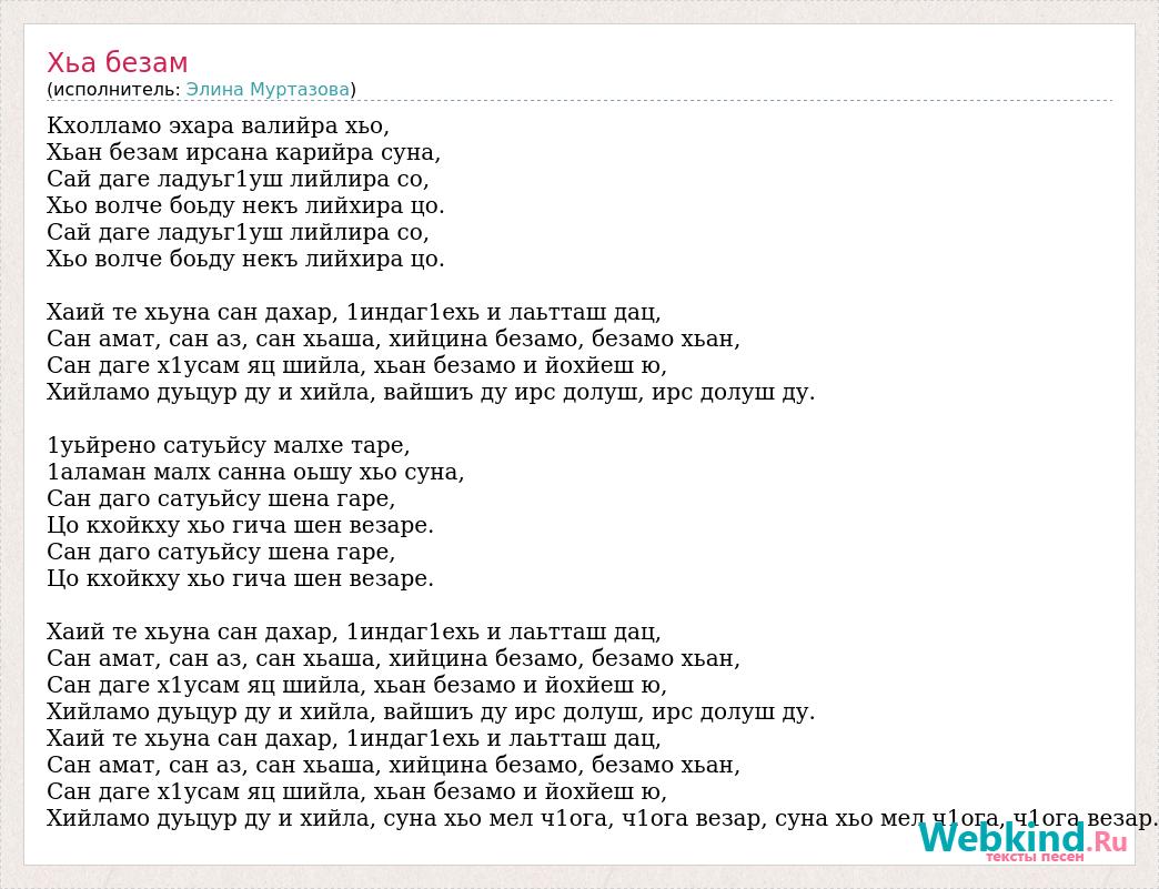 Кхолламо эхара валийра хьо, Хьан безам ирсана карийра суна, Сай даге ладуьг1уш лийлира со, Хьо волче боьду некъ лийхира цо. Сай даге ладуьг1уш лийлира со, Хьо волче боьду некъ лийхира цо. Хаий те хьуна сан дахар, 1индаг1ехь и лаьтташ дац, Сан амат, сан аз, сан хьаша, хийцина безамо, безамо хьан, Сан даге х1усам яц шийла, хьан безамо и йохйеш ю, Хийламо дуьцур ду и хийла, вайшиъ ду ирс долуш, ирс долуш ду. 1уьйрено сатуьйсу малхе таре, 1аламан малх санна оьшу хьо суна, Сан даго сатуьйсу шена гаре, Цо кхойкху хьо гича шен везаре. Сан даго сатуьйсу шена гаре, Цо кхойкху хьо гича шен везаре. Хаий те хьуна сан дахар, 1индаг1ехь и лаьтташ дац, Сан амат, сан аз, сан хьаша, хийцина безамо, безамо хьан, Сан даге х1усам яц шийла, хьан безамо и йохйеш ю, Хийламо дуьцур ду и хийла, вайшиъ ду ирс долуш, ирс долуш ду. Хаий те хьуна сан дахар, 1индаг1ехь и лаьтташ дац, Сан амат, сан аз, сан хьаша, хийцина безамо, безамо хьан, Сан даге х1усам яц шийла, хьан безамо и йохйеш ю, Хийламо дуьцур ду и хийла, суна хьо мел ч1ога, ч1ога везар, суна хьо мел ч1ога, ч1ога везар.