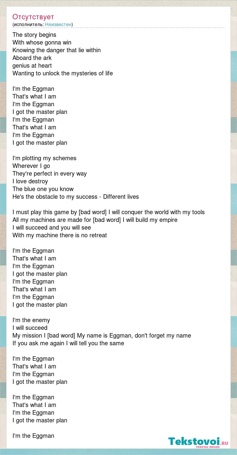 The story begins With whose gonna win Knowing the danger that lie within Aboard the ark genius at heart Wanting to unlock the mysteries of life I'm the Eggman That's what I am I'm the Eggman I got the master plan I'm the Eggman That's what I am I'm the Eggman I got the master plan I'm plotting my schemes Wherever I go They're perfect in every way I love destroy The blue one you know He's the obstacle to my success - Different lives I must play this game by my rules I will conquer the world with my tools All my machines are made for destruction I will build my empire I will succeed and you will see With my machine there is no retreat I'm the Eggman That's what I am I'm the Eggman I got the master plan I'm the Eggman That's what I am I'm the Eggman I got the master plan I'm the enemy I will succeed My mission I must complete My name is Eggman, don't forget my name If you ask me again I will tell you the same I'm the Eggman That's what I am I'm the Eggman I got the master plan I'm the Eggman That's what I am I'm the Eggman I got the master plan I'm the Eggman