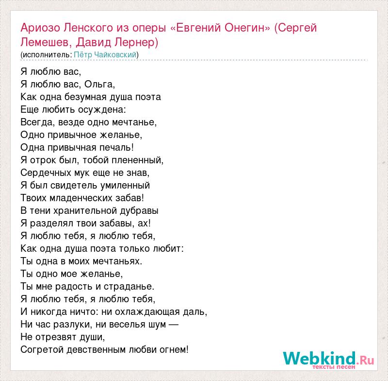 А как ты думаешь, о чем песня "Ариозо Ленского из оперы «Евгений Онегин» (Сергей Лемешев, Давид Лернер)" ?