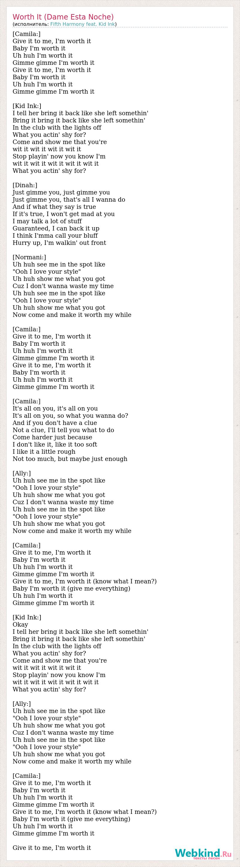 [Camila:] Give it to me, I'm worth it Baby I'm worth it Uh huh I'm worth it Gimme gimme I'm worth it Give it to me, I'm worth it Baby I'm worth it Uh huh I'm worth it Gimme gimme I'm worth it [Kid Ink:] I tell her bring it back like she left somethin' Bring it bring it back like she left somethin' In the club with the lights off What you actin' shy for? Come and show me that you're wit it wit it wit it wit it Stop playin' now you know I'm wit it wit it wit it wit it wit it What you actin' shy for? [Dinah:] Just gimme you, just gimme you Just gimme you, that's all I wanna do And if what they say is true If it's true, I won't get mad at you I may talk a lot of stuff Guaranteed, I can back it up I think I'mma call your bluff Hurry up, I'm walkin' out front [Normani:] Uh huh see me in the spot like "Ooh I love your style" Uh huh show me what you got Cuz I don't wanna waste my time Uh huh see me in the spot like "Ooh I love your style" Uh huh show me what you got Now come and make it worth my while [Camila:] Give it to me, I'm worth it Baby I'm worth it Uh huh I'm worth it Gimme gimme I'm worth it Give it to me, I'm worth it Baby I'm worth it Uh huh I'm worth it Gimme gimme I'm worth it [Camila:] It's all on you, it's all on you It's all on you, so what you wanna do? And if you don't have a clue Not a clue, I'll tell you what to do Come harder just because I don't like it, like it too soft I like it a little rough Not too much, but maybe just enough [Ally:] Uh huh see me in the spot like "Ooh I love your style" Uh huh show me what you got Cuz I don't wanna waste my time Uh huh see me in the spot like "Ooh I love your style" Uh huh show me what you got Now come and make it worth my while [Camila:] Give it to me, I'm worth it Baby I'm worth it Uh huh I'm worth it Gimme gimme I'm worth it Give it to me, I'm worth it (know what I mean?) Baby I'm worth it (give me everything) Uh huh I'm worth it Gimme gimme I'm worth it [Kid Ink:] Okay I tell her bring it back like she left somethin' Bring it bring it back like she left somethin' In the club with the lights off What you actin' shy for? Come and show me that you're wit it wit it wit it wit it Stop playin' now you know I'm wit it wit it wit it wit it wit it What you actin' shy for? [Ally:] Uh huh see me in the spot like "Ooh I love your style" Uh huh show me what you got Cuz I don't wanna waste my time Uh huh see me in the spot like "Ooh I love your style" Uh huh show me what you got Now come and make it worth my while [Camila:] Give it to me, I'm worth it Baby I'm worth it Uh huh I'm worth it Gimme gimme I'm worth it Give it to me, I'm worth it (know what I mean?) Baby I'm worth it (give me everything) Uh huh I'm worth it Gimme gimme I'm worth it Give it to me, I'm worth it