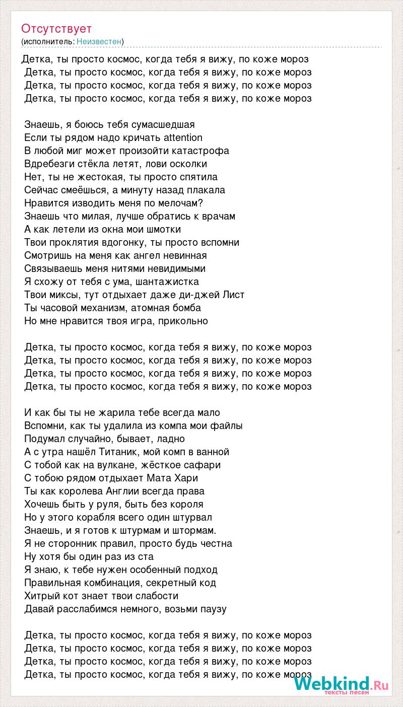 Детка, ты просто космос, когда тебя я вижу, по коже мороз Детка, ты просто космос, когда тебя я вижу, по коже мороз Детка, ты просто космос, когда тебя я вижу, по коже мороз Детка, ты просто космос, когда тебя я вижу, по коже мороз Знаешь, я боюсь тебя сумасшедшая Если ты рядом надо кричать attention В любой миг может произойти катастрофа Вдребезги стёкла летят, лови осколки Нет, ты не жестокая, ты просто спятила Сейчас смеёшься, а минуту назад плакала Нравится изводить меня по мелочам? Знаешь что милая, лучше обратись к врачам А как летели из окна мои шмотки Твои проклятия вдогонку, ты просто вспомни Смотришь на меня как ангел невинная Связываешь меня нитями невидимыми Я схожу от тебя с ума, шантажистка Твои миксы, тут отдыхает даже ди-джей Лист Ты часовой механизм, атомная бомба Но мне нравится твоя игра, прикольно Детка, ты просто космос, когда тебя я вижу, по коже мороз Детка, ты просто космос, когда тебя я вижу, по коже мороз Детка, ты просто космос, когда тебя я вижу, по коже мороз Детка, ты просто космос, когда тебя я вижу, по коже мороз И как бы ты не жарила тебе всегда мало Вспомни, как ты удалила из компа мои файлы Подумал случайно, бывает, ладно А с утра нашёл Титаник, мой комп в ванной С тобой как на вулкане, жёсткое сафари С тобою рядом отдыхает Мата Хари Ты как королева Англии всегда права Хочешь быть у руля, быть без короля Но у этого корабля всего один штурвал Знаешь, и я готов к штурмам и штормам. Я не сторонник правил, просто будь честна Ну хотя бы один раз из ста Я знаю, к тебе нужен особенный подход Правильная комбинация, секретный код Хитрый кот знает твои слабости Давай расслабимся немного, возьми паузу Детка, ты просто космос, когда тебя я вижу, по коже мороз Детка, ты просто космос, когда тебя я вижу, по коже мороз Детка, ты просто космос, когда тебя я вижу, по коже мороз Детка, ты просто космос, когда тебя я вижу, по коже мороз