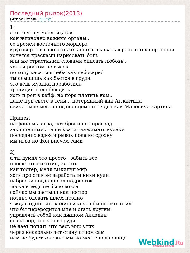 1) это то что у меня внутри как жизненно важные органы.. со времен восточного мордера круговорот в голове и желание высказать в репе с тех пор порой хочется красками нарисовать боль или же страстными словами описать любовь... хоть и ростом не высок но хочу касаться неба как небоскреб ты слышишь как бьется в груди это ведь музыка поработила традиции надо блюдить хоть и реп в кайф. но пора платить нам.. даже при свете в тени .. потерянный как Атлантида сейчас мое место под солнцем выглядит как Малевича картина Припев: на фоне мы игра, нет брони нет преград законченный этап и хватит зажимать кулаки последних вздох и рывок пока не сдохну мы игра но фон рисуем сами 2) а ты думал это просто - забыть все плоскость никотин, злость как тостер, меня выкинул мир хоть про став не заработали ники нули наброски когда писал подросток лоска и ведь не было вовсе сейчас мы застыли как постер поздно одевать шлем поздно я ждал один.. апокалипсиса что бы он сколотил что бы переродится мне и стать другим управлять собой как джином Алладин фольклор, тот что в груди не дает понять что весь мир утих через несколько лет стану отцом сам нам не будет холодно мы на месте под солнце