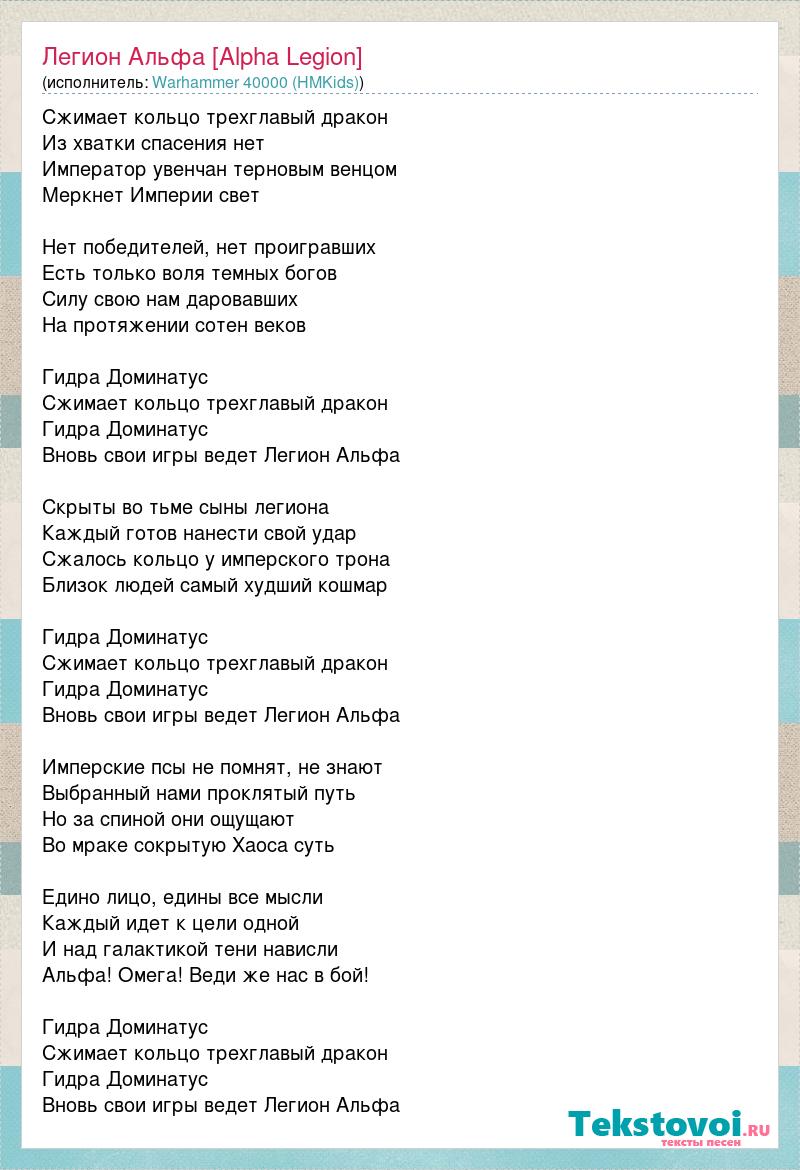 Сжимает кольцо трехглавый дракон Из хватки спасения нет Император увенчан терновым венцом Меркнет Империи свет Нет победителей, нет проигравших Есть только воля темных богов Силу свою нам даровавших На протяжении сотен веков Гидра Доминатус Сжимает кольцо трехглавый дракон Гидра Доминатус Вновь свои игры ведет Легион Альфа Скрыты во тьме сыны легиона Каждый готов нанести свой удар Сжалось кольцо у имперского трона Близок людей самый худший кошмар Гидра Доминатус Сжимает кольцо трехглавый дракон Гидра Доминатус Вновь свои игры ведет Легион Альфа Имперские псы не помнят, не знают Выбранный нами проклятый путь Но за спиной они ощущают Во мраке сокрытую Хаоса суть Едино лицо, едины все мысли Каждый идет к цели одной И над галактикой тени нависли Альфа! Омега! Веди же нас в бой! Гидра Доминатус Сжимает кольцо трехглавый дракон Гидра Доминатус Вновь свои игры ведет Легион Альфа