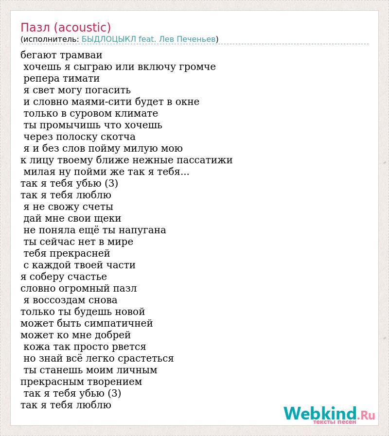 бегают трамваи хочешь я сыграю или включу громче репера тимати я свет могу погасить и словно маями-сити будет в окне только в суровом климате ты промычишь что хочешь через полоску скотча я и без слов пойму милую мою к лицу твоему ближе нежные пассатижи милая ну пойми же так я тебя... так я тебя убью (3) так я тебя люблю я не свожу счеты дай мне свои щеки не поняла ещё ты напугана ты сейчас нет в мире тебя прекрасней с каждой твоей части я соберу счастье словно огромный пазл я воссоздам снова только ты будешь новой может быть симпатичней может ко мне добрей кожа так просто рвется но знай всё легко срастеться ты станешь моим личным прекрасным творением так я тебя убью (3) так я тебя люблю