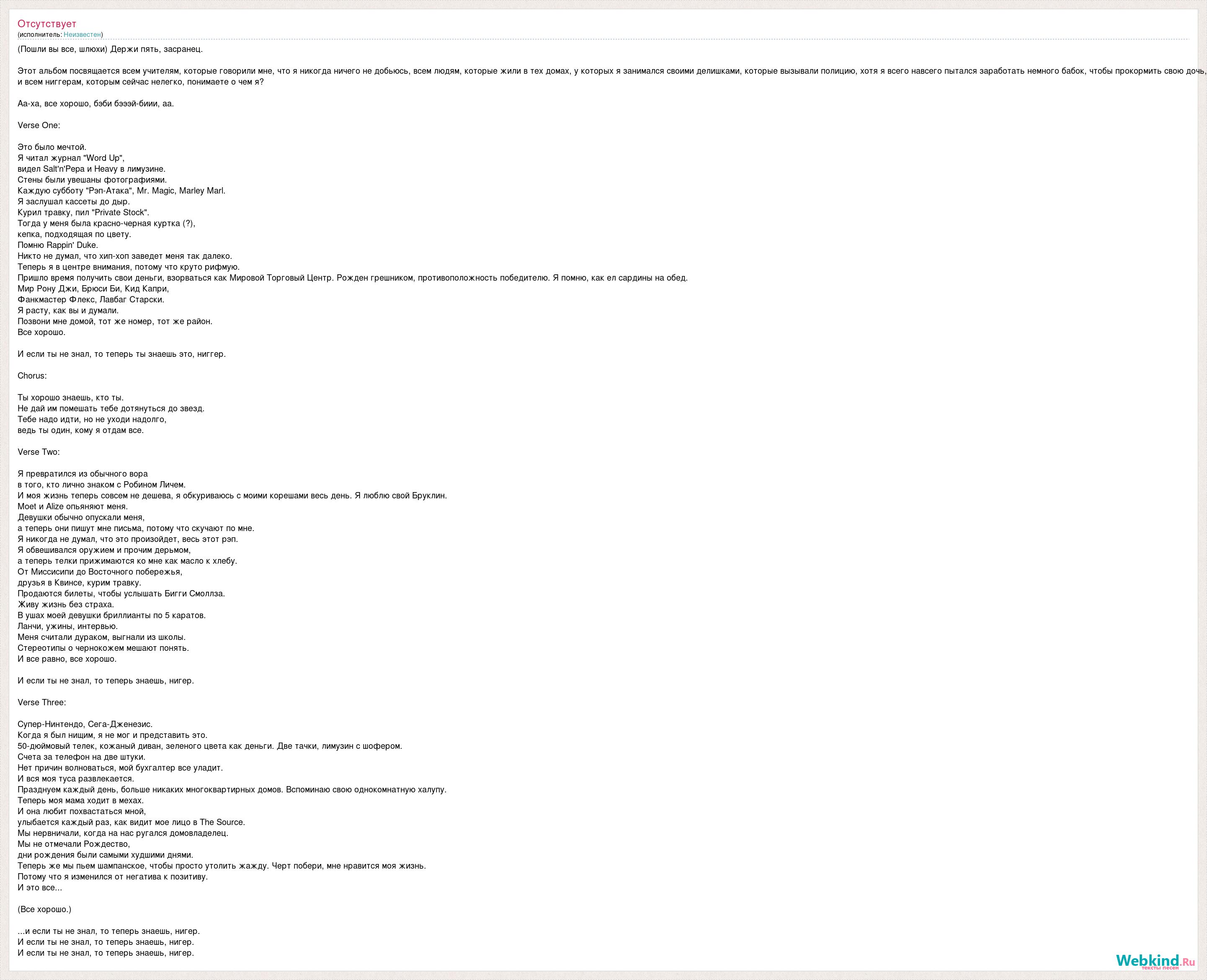 (Пошли вы все, шлюхи) Держи пять, засранец. Этот альбом посвящается всем учителям, которые говорили мне, что я никогда ничего не добьюсь, всем людям, которые жили в тех домах, у которых я занимался своими делишками, которые вызывали полицию, хотя я всего навсего пытался заработать немного бабок, чтобы прокормить свою дочь, и всем ниггерам, которым сейчас нелегко, понимаете о чем я? Аа-ха, все хорошо, бэби бэээй-биии, аа. Verse One: Это было мечтой. Я читал журнал "Word Up", видел Salt'n'Pepa и Heavy в лимузине. Стены были увешаны фотографиями. Каждую субботу "Рэп-Атака", Mr. Magic, Marley Marl. Я заслушал кассеты до дыр. Курил травку, пил "Private Stock". Тогда у меня была красно-черная куртка (?), кепка, подходящая по цвету. Помню Rappin' Duke. Никто не думал, что хип-хоп заведет меня так далеко. Теперь я в центре внимания, потому что круто рифмую. Пришло время получить свои деньги, взорваться как Мировой Торговый Центр. Рожден грешником, противоположность победителю. Я помню, как ел сардины на обед. Мир Рону Джи, Брюси Би, Кид Капри, Фанкмастер Флекс, Лавбаг Старски. Я расту, как вы и думали. Позвони мне домой, тот же номер, тот же район. Все хорошо. И если ты не знал, то теперь ты знаешь это, ниггер. Chorus: Ты хорошо знаешь, кто ты. Не дай им помешать тебе дотянуться до звезд. Тебе надо идти, но не уходи надолго, ведь ты один, кому я отдам все. Verse Two: Я превратился из обычного вора в того, кто лично знаком с Робином Личем. И моя жизнь теперь совсем не дешева, я обкуриваюсь с моими корешами весь день. Я люблю свой Бруклин. Moet и Alize опьяняют меня. Девушки обычно опускали меня, а теперь они пишут мне письма, потому что скучают по мне. Я никогда не думал, что это произойдет, весь этот рэп. Я обвешивался оружием и прочим дерьмом, а теперь телки прижимаются ко мне как масло к хлебу. От Миссисипи до Восточного побережья, друзья в Квинсе, курим травку. Продаются билеты, чтобы услышать Бигги Смоллза. Живу жизнь без страха. В ушах моей девушки бриллианты по 5 каратов. Ланчи, ужины, интервью. Меня считали дураком, выгнали из школы. Стереотипы о чернокожем мешают понять. И все равно, все хорошо. И если ты не знал, то теперь знаешь, нигер. Verse Three: Супер-Нинтендо, Сега-Дженезис. Когда я был нищим, я не мог и представить это. 50-дюймовый телек, кожаный диван, зеленого цвета как деньги. Две тачки, лимузин с шофером. Счета за телефон на две штуки. Нет причин волноваться, мой бухгалтер все уладит. И вся моя туса развлекается. Празднуем каждый день, больше никаких многоквартирных домов. Вспоминаю свою однокомнатную халупу. Теперь моя мама ходит в мехах. И она любит похвастаться мной, улыбается каждый раз, как видит мое лицо в The Source. Мы нервничали, когда на нас ругался домовладелец. Мы не отмечали Рождество, дни рождения были самыми худшими днями. Теперь же мы пьем шампанское, чтобы просто утолить жажду. Черт побери, мне нравится моя жизнь. Потому что я изменился от негатива к позитиву. И это все... (Все хорошо.) ...и если ты не знал, то теперь знаешь, нигер. И если ты не знал, то теперь знаешь, нигер. И если ты не знал, то теперь знаешь, нигер.