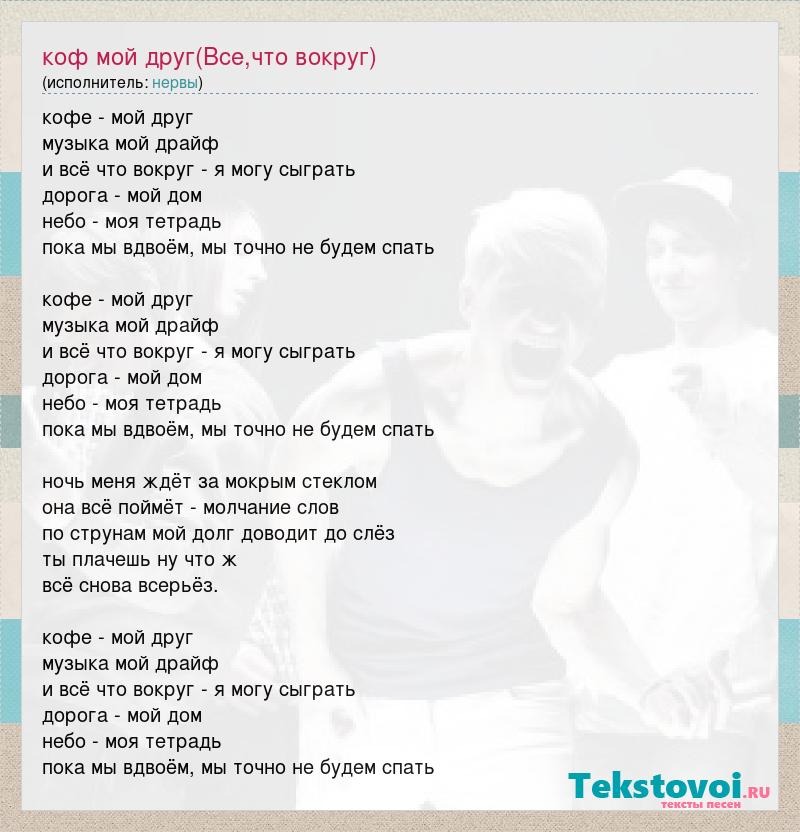кофе - мой друг музыка мой драйф и всё что вокруг - я могу сыграть дорога - мой дом небо - моя тетрадь пока мы вдвоём, мы точно не будем спать кофе - мой друг музыка мой драйф и всё что вокруг - я могу сыграть дорога - мой дом небо - моя тетрадь пока мы вдвоём, мы точно не будем спать ночь меня ждёт за мокрым стеклом она всё поймёт - молчание слов по струнам мой долг доводит до слёз ты плачешь ну что ж всё снова всерьёз. кофе - мой друг музыка мой драйф и всё что вокруг - я могу сыграть дорога - мой дом небо - моя тетрадь пока мы вдвоём, мы точно не будем спать