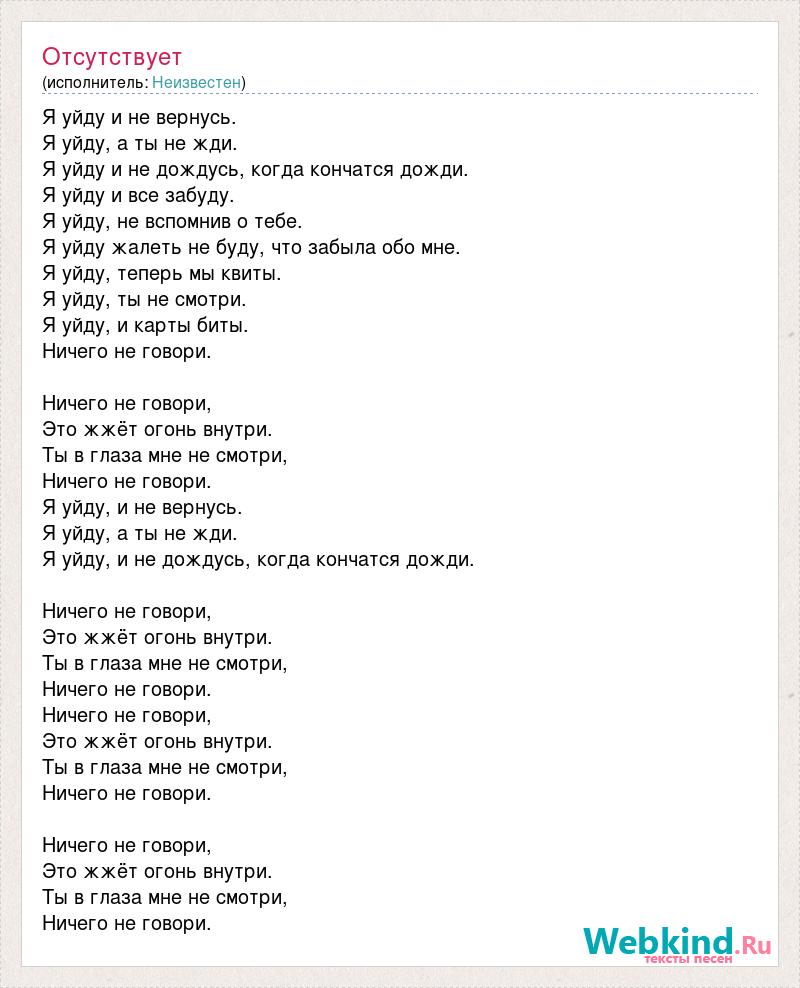 Я уйду и не вернусь. Я уйду, а ты не жди. Я уйду и не дождусь, когда кончатся дожди. Я уйду и все забуду. Я уйду, не вспомнив о тебе. Я уйду жалеть не буду, что забыла обо мне. Я уйду, теперь мы квиты. Я уйду, ты не смотри. Я уйду, и карты биты. Ничего не говори. Ничего не говори, Это жжёт огонь внутри. Ты в глаза мне не смотри, Ничего не говори. Я уйду, и не вернусь. Я уйду, а ты не жди. Я уйду, и не дождусь, когда кончатся дожди. Ничего не говори, Это жжёт огонь внутри. Ты в глаза мне не смотри, Ничего не говори. Ничего не говори, Это жжёт огонь внутри. Ты в глаза мне не смотри, Ничего не говори. Ничего не говори, Это жжёт огонь внутри. Ты в глаза мне не смотри, Ничего не говори.