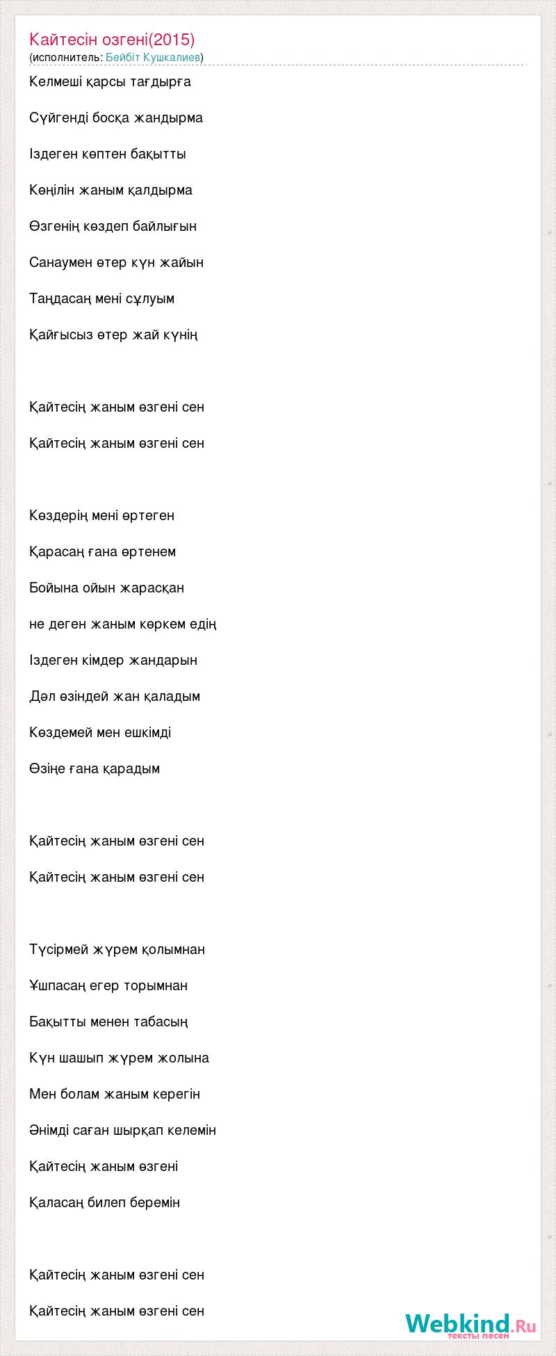 Келмеші қарсы тағдырға Сүйгенді босқа жандырма Іздеген көптен бақытты Көңілін жаным қалдырма Өзгенің көздеп байлығын Санаумен өтер күн жайын Таңдасаң мені сұлуым Қайғысыз өтер жай күнің Қайтесің жаным өзгені сен Қайтесің жаным өзгені сен Көздерің мені өртеген Қарасаң ғана өртенем Бойына ойын жарасқан не деген жаным көркем едің Іздеген кімдер жандарын Дәл өзіндей жан қаладым Көздемей мен ешкімді Өзіңе ғана қарадым Қайтесің жаным өзгені сен Қайтесің жаным өзгені сен Түсірмей жүрем қолымнан Ұшпасаң егер торымнан Бақытты менен табасың Күн шашып жүрем жолына Мен болам жаным керегін Әнімді саған шырқап келемін Қайтесің жаным өзгені Қаласаң билеп беремін Қайтесің жаным өзгені сен Қайтесің жаным өзгені сен