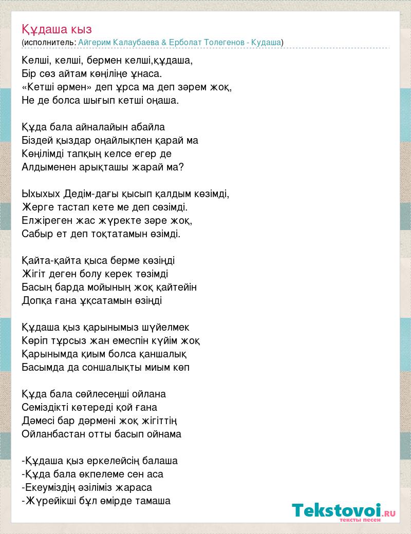 Келші, келші, бермен келші,құдаша, Бір сөз айтам көңіліңе ұнаса. «Кетші әрмен» деп ұрса ма деп зәрем жоқ, Не де болса шығып кетші оңаша. Құда бала айналайын абайла Біздей қыздар оңайлықпен қарай ма Көңілімді тапқың келсе егер де Алдыменен арықташы жарай ма? Ыхыхых Дедім-дағы қысып қалдым көзімді, Жерге тастап кете ме деп сөзімді. Елжіреген жас жүректе зәре жоқ, Сабыр ет деп тоқтатамын өзімді. Қайта-қайта қыса берме көзіңді Жігіт деген болу керек төзімді Басың барда мойының жоқ қайтейін Допқа ғана ұқсатамын өзіңді Құдаша қыз қарынымыз шүйелмек Көріп тұрсыз жан емеспін күйім жоқ Қарынымда қиым болса қаншалық Басымда да соншалықты миым көп Құда бала сөйлесеңші ойлана Семіздікті көтереді қой ғана Дәмесі бар дәрмені жоқ жігіттің Ойланбастан отты басып ойнама -Құдаша қыз еркелейсің балаша -Құда бала өкпелеме сен аса -Екеуміздің әзіліміз жараса -Жүрейікші бұл өмірде тамаша