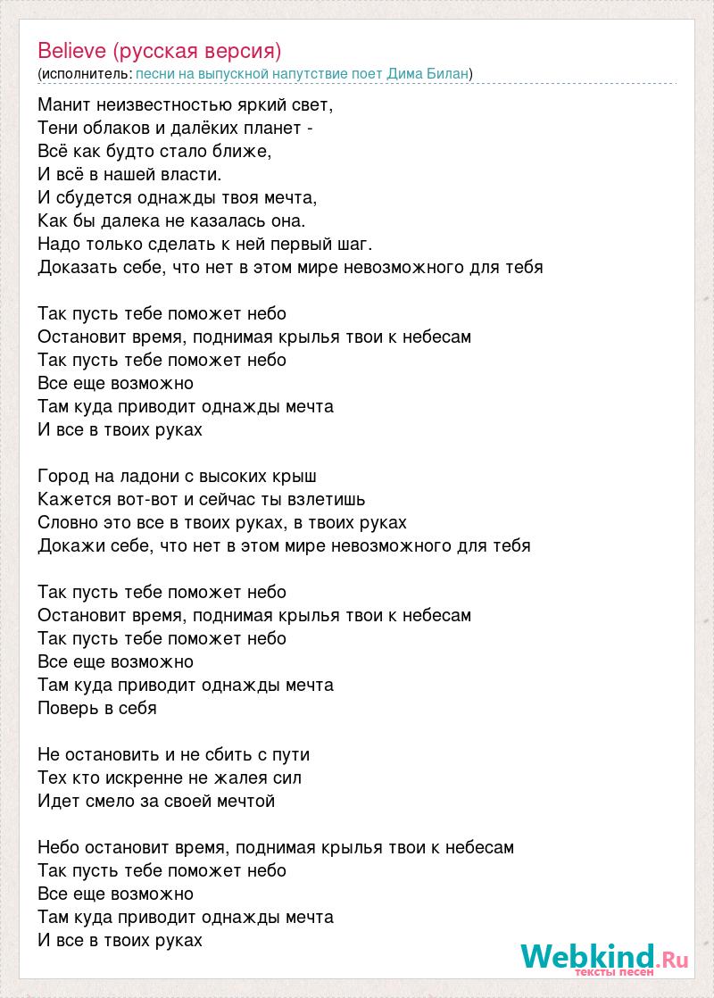Манит неизвестностью яркий свет, Тени облаков и далёких планет - Всё как будто стало ближе, И всё в нашей власти. И сбудется однажды твоя мечта, Как бы далека не казалась она. Надо только сделать к ней первый шаг. Доказать себе, что нет в этом мире невозможного для тебя Так пусть тебе поможет небо Остановит время, поднимая крылья твои к небесам Так пусть тебе поможет небо Все еще возможно Там куда приводит однажды мечта И все в твоих руках Город на ладони с высоких крыш Кажется вот-вот и сейчас ты взлетишь Словно это все в твоих руках, в твоих руках Докажи себе, что нет в этом мире невозможного для тебя Так пусть тебе поможет небо Остановит время, поднимая крылья твои к небесам Так пусть тебе поможет небо Все еще возможно Там куда приводит однажды мечта Поверь в себя Не остановить и не сбить с пути Тех кто искренне не жалея сил Идет смело за своей мечтой Небо остановит время, поднимая крылья твои к небесам Так пусть тебе поможет небо Все еще возможно Там куда приводит однажды мечта И все в твоих руках