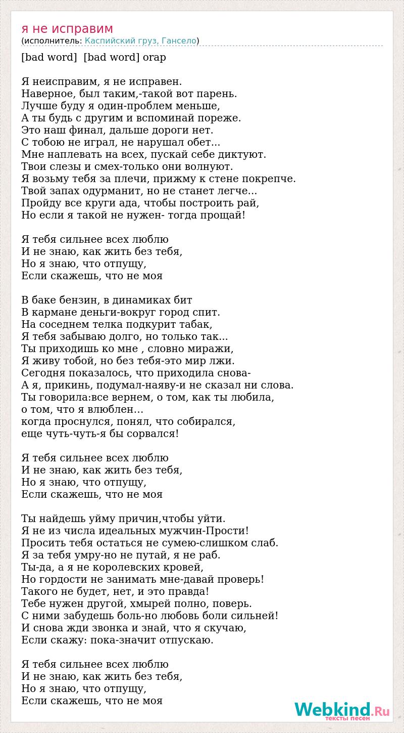 [bad word] [bad word] orap Я неисправим, я не исправен. Наверное, был таким,-такой вот парень. Лучше буду я один-проблем меньше, А ты будь с другим и вспоминай пореже. Это наш финал, дальше дороги нет. С тобою не играл, не нарушал обет... Мне наплевать на всех, пускай себе диктуют. Твои слезы и смех-только они волнуют. Я возьму тебя за плечи, прижму к стене покрепче. Твой запах одурманит, но не станет легче... Пройду все круги ада, чтобы построить рай, Но если я такой не нужен- тогда прощай! Я тебя сильнее всех люблю И не знаю, как жить без тебя, Но я знаю, что отпущу, Если скажешь, что не моя В баке бензин, в динамиках бит В кармане деньги-вокруг город спит. На соседнем телка подкурит табак, Я тебя забываю долго, но только так... Ты приходишь ко мне , словно миражи, Я живу тобой, но без тебя-это мир лжи. Сегодня показалось, что приходила снова- А я, прикинь, подумал-наяву-и не сказал ни слова. Ты говорила:все вернем, о том, как ты любила, о том, что я влюблен… когда проснулся, понял, что собирался, еще чуть-чуть-я бы сорвался! Я тебя сильнее всех люблю И не знаю, как жить без тебя, Но я знаю, что отпущу, Если скажешь, что не моя Ты найдешь уйму причин,чтобы уйти. Я не из числа идеальных мужчин-Прости! Просить тебя остаться не сумею-слишком слаб. Я за тебя умру-но не путай, я не раб. Ты-да, а я не королевских кровей, Но гордости не занимать мне-давай проверь! Такого не будет, нет, и это правда! Тебе нужен другой, хмырей полно, поверь. С ними забудешь боль-но любовь боли сильней! И снова жди звонка и знай, что я скучаю, Если скажу: пока-значит отпускаю. Я тебя сильнее всех люблю И не знаю, как жить без тебя, Но я знаю, что отпущу, Если скажешь, что не моя