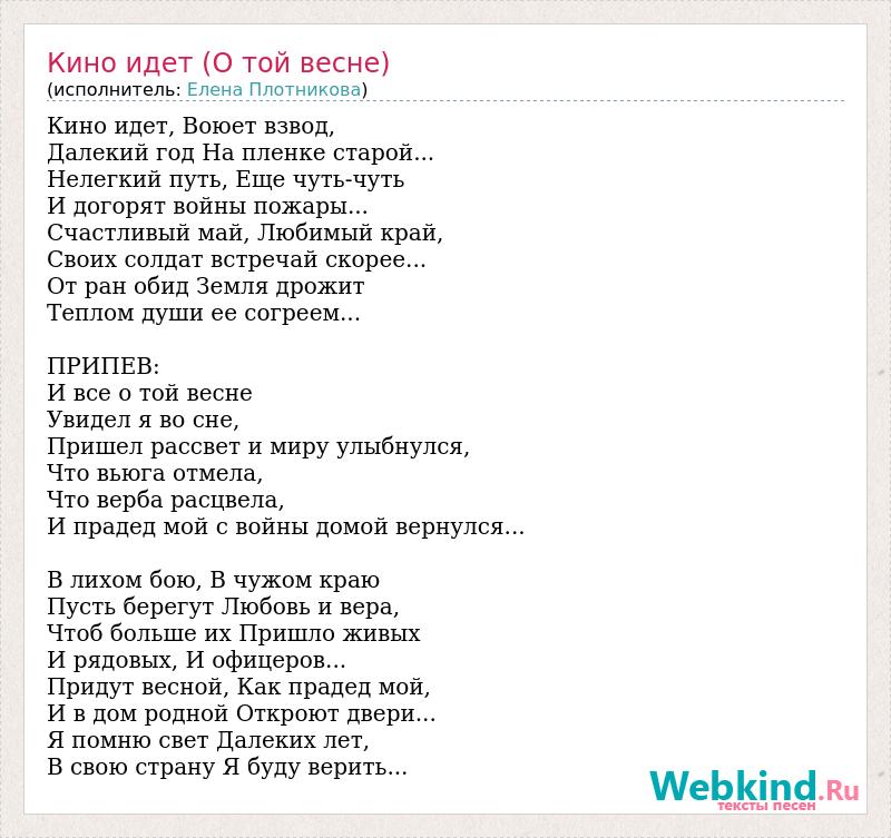 Кино идет, Воюет взвод, Далекий год На пленке старой... Нелегкий путь, Еще чуть-чуть И догорят войны пожары... Счастливый май, Любимый край, Своих солдат встречай скорее... От ран обид Земля дрожит Теплом души ее согреем... ПРИПЕВ: И все о той весне Увидел я во сне, Пришел рассвет и миру улыбнулся, Что вьюга отмела, Что верба расцвела, И прадед мой с войны домой вернулся... В лихом бою, В чужом краю Пусть берегут Любовь и вера, Чтоб больше их Пришло живых И рядовых, И офицеров... Придут весной, Как прадед мой, И в дом родной Откроют двери... Я помню свет Далеких лет, В свою страну Я буду верить...