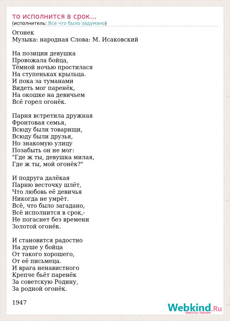 Огонек Музыка: народная Слова: М. Исаковский На позиции девушка Провожала бойца, Тёмной ночью простилася На ступеньках крыльца. И пока за туманами Видеть мог паренёк, На окошке на девичьем Всё горел огонёк. Парня встретила дружная Фронтовая семья, Всюду были товарищи, Всюду были друзья, Но знакомую улицу Позабыть он не мог: "Где ж ты, девушка милая, Где ж ты, мой огонёк?" И подруга далёкая Парню весточку шлёт, Что любовь её девичья Никогда не умрёт. Всё, что было загадано, Всё исполнится в срок,- Не погаснет без времени Золотой огонёк. И становится радостно На душе у бойца От такого хорошего, От её письмеца. И врага ненавистного Крепче бьёт паренёк За советскую Родину, За родной огонёк. 1947