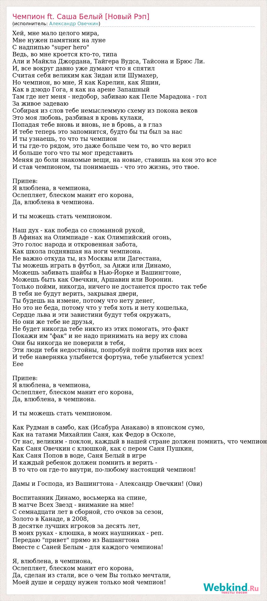 Хей, мне мало целого мира, Мне нужен памятник на луне С надпипью "super hero" Ведь, во мне кроется кто-то, типа Али и Майкла Джордана, Тайгера Вудса, Тайсона и Брюс Ли. И, все вокруг давно уже думают что я спятил Считая себя великим как Зидан или Шумахер, Но чемпион, во мне, Я как Карелин, как Яшин, Как в дзюдо Гога, я как на арене Запашный Там где нет меня - недобор, забиваю как Пеле Марадона - гол За живое задеваю Собирая из слов тебе немыслеммую схему из покона веков Это моя любовь, разбивая в кровь кулаки, Попадая тебе вновь и вновь, не в бровь, а в глаз И тебе теперь это запомнится, будто бы ты был за нас И ты узнаешь, то что ты чемпион И ты где-то рядом, это даже больше чем то, во что верил И больше того что ты мог представить Меняя до боли знакомые вещи, на новые, ставишь на кон это все И став чемпионом, ты понимаешь - что это жизнь, это твое. Припев: Я влюблена, в чемпиона, Ослепляет, блеском манит его корона, Да, влюблена в чемпиона. И ты можешь стать чемпионом. Наш дух - как победа со сломанной рукой, В Афинах на Олимпиаде - как Олимпийский огонь, Это голос народа и откровенная забота, Как школа поднявшая на ноги чемпиона. Не важно откуда ты, из Москвы или Дагестана, Ты можешь играть в футбол, за Анжи или Динамо, Можешь забивать шайбы в Нью-Йорке и Вашингтоне, Можешь быть как Овечкин, Аршавин или Воронин. Только пойми, никогда, ничего не достанется просто так тебе В тебя не будут верить, закрывая двери, Ты будешь на измене, потому что нету денег, Но это не беда, потому что у тебя хоть и нету кошелька, Сердце льва и эти завистини будут тебя окружать, Но они же тебе не друзья, Не будет никогда тебе никто из этих помогать, это факт Покажи им "фак" и не надо принимать на веру их слова Они бы никогда не поверили в тебя, Эти люди тебя недостойны, попробуй пойти против них всех И тебе наверняка улыбнется фортуна, тебе улыбнется успех! Еее Припев: Я влюблена, в чемпиона, Ослепляет, блеском манит его корона, Да, влюблена, в чемпиона. И ты можешь стать чемпионом. Как Рудман в самбо, как (Исабура Анакаво) в японском сумо, Как на татами Михайлин Саня, как Федор в Осколе, От нас, великим - поклон, каждый в нашей стране должен помнить, что чемпион Как Саня Овечкин с клюшкой, как с пером Саня Пушкин, Как Саня Попов в воде, Саня Белый в игре И каждый ребенок должен помнить и верить - В то что он где-то внутри, по-любому настоящий чемпион! Дамы и Господа, из Вашингтона - Александр Овечкин! (Ови) Воспитанник Динамо, восьмерка на спине, В матче Всех Звезд - внимание на мне! С семнадцати лет в сборной, сто очков за сезон, Золото в Канаде, в 2008, В десятке лучших игроков за десять лет, В моих руках - клюшка, в моих наушниках - реп. Передаю "привет" прямо из Вашангтона Вместе с Саней Белым - для каждого чемпиона! Я, влюблена, в чемпиона, Ослепляет, блеском манит его корона, Да, сделан из стали, все о чем Вы только мечтали, Моей душе и сердцу нужен только мой чемпион!