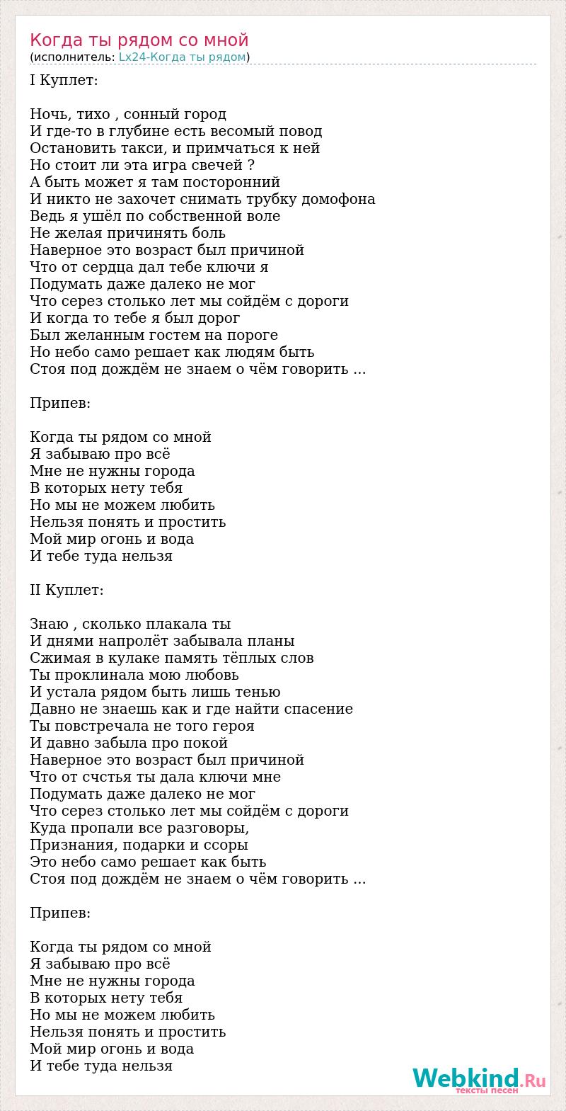 I Куплет: Ночь, тихо , сонный город И где-то в глубине есть весомый повод Остановить такси, и примчаться к ней Но стоит ли эта игра свечей ? А быть может я там посторонний И никто не захочет снимать трубку домофона Ведь я ушёл по собственной воле Не желая причинять боль Наверное это возраст был причиной Что от сердца дал тебе ключи я Подумать даже далеко не мог Что серез столько лет мы сойдём с дороги И когда то тебе я был дорог Был желанным гостем на пороге Но небо само решает как людям быть Стоя под дождём не знаем о чём говорить ... Припев: Когда ты рядом со мной Я забываю про всё Мне не нужны города В которых нету тебя Но мы не можем любить Нельзя понять и простить Мой мир огонь и вода И тебе туда нельзя II Куплет: Знаю , сколько плакала ты И днями напролёт забывала планы Сжимая в кулаке память тёплых слов Ты проклинала мою любовь И устала рядом быть лишь тенью Давно не знаешь как и где найти спасение Ты повстречала не того героя И давно забыла про покой Наверное это возраст был причиной Что от счстья ты дала ключи мне Подумать даже далеко не мог Что серез столько лет мы сойдём с дороги Куда пропали все разговоры, Признания, подарки и ссоры Это небо само решает как быть Стоя под дождём не знаем о чём говорить ... Припев: Когда ты рядом со мной Я забываю про всё Мне не нужны города В которых нету тебя Но мы не можем любить Нельзя понять и простить Мой мир огонь и вода И тебе туда нельзя