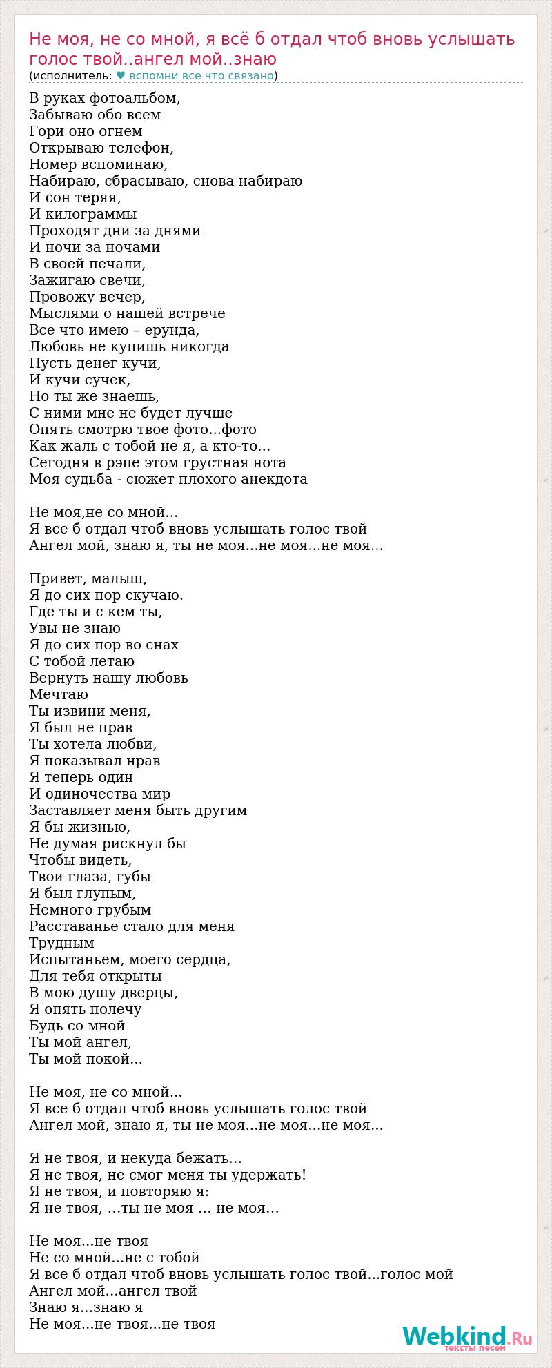 В руках фотоальбом, Забываю обо всем Гори оно огнем Открываю телефон, Номер вспоминаю, Набираю, сбрасываю, снова набираю И сон теряя, И килограммы Проходят дни за днями И ночи за ночами В своей печали, Зажигаю свечи, Провожу вечер, Мыслями о нашей встрече Все что имею – ерунда, Любовь не купишь никогда Пусть денег кучи, И кучи сучек, Но ты же знаешь, С ними мне не будет лучше Опять смотрю твое фото...фото Как жаль с тобой не я, а кто-то... Сегодня в рэпе этом грустная нота Моя судьба - сюжет плохого анекдота Не моя,не со мной... Я все б отдал чтоб вновь услышать голос твой Ангел мой, знаю я, ты не моя...не моя...не моя... Привет, малыш, Я до сих пор скучаю. Где ты и с кем ты, Увы не знаю Я до сих пор во снах С тобой летаю Вернуть нашу любовь Мечтаю Ты извини меня, Я был не прав Ты хотела любви, Я показывал нрав Я теперь один И одиночества мир Заставляет меня быть другим Я бы жизнью, Не думая рискнул бы Чтобы видеть, Твои глаза, губы Я был глупым, Немного грубым Расставанье стало для меня Трудным Испытаньем, моего сердца, Для тебя открыты В мою душу дверцы, Я опять полечу Будь со мной Ты мой ангел, Ты мой покой... Не моя, не со мной... Я все б отдал чтоб вновь услышать голос твой Ангел мой, знаю я, ты не моя...не моя...не моя... Я не твоя, и некуда бежать… Я не твоя, не смог меня ты удержать! Я не твоя, и повторяю я: Я не твоя, …ты не моя … не моя… Не моя...не твоя Не со мной...не с тобой Я все б отдал чтоб вновь услышать голос твой...голос мой Ангел мой...ангел твой Знаю я...знаю я Не моя...не твоя...не твоя