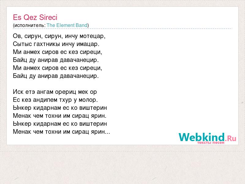Ов, сирун, сирун, инчу мотецар, Сытыс гахтникы инчу имацар. Ми анмех сиров ес кез сиреци, Байц ду анирав давачанецир. Ми анмех сиров ес кез сиреци, Байц ду анирав давачанецир. Иск етэ ангам орериц мек ор Ес кез андипем тхур у молор. Ынкер кидарнам ес ко виштерин Менак чем тохни им сирац ярин. Ынкер кидарнам ес ко виштерин Менак чем тохни им сирац ярин...