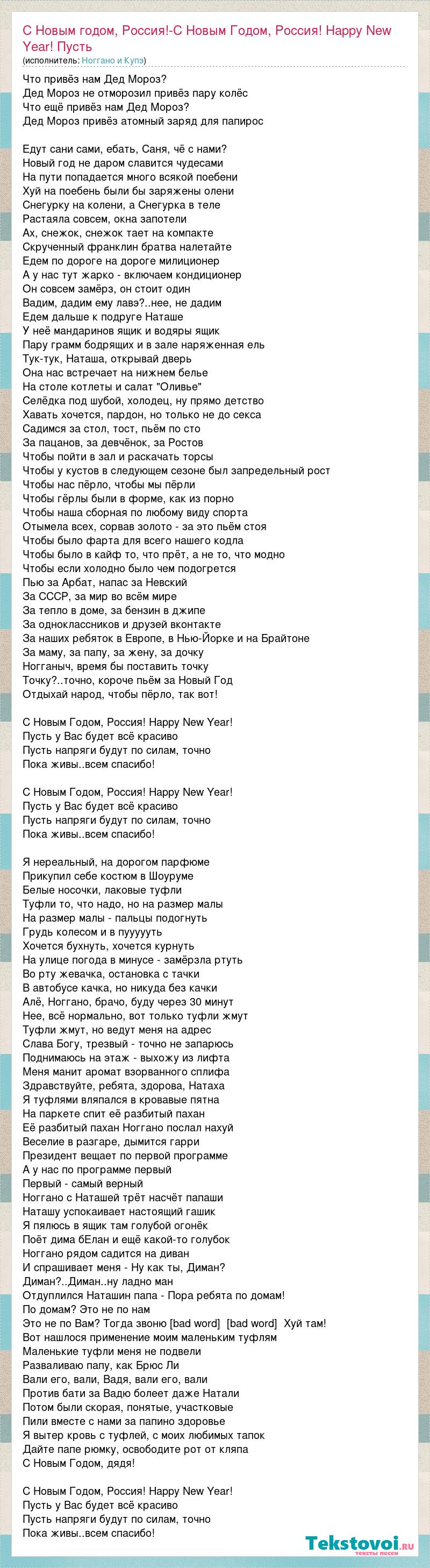 Что привёз нам Дед Мороз? Дед Мороз не отморозил привёз пару колёс Что ещё привёз нам Дед Мороз? Дед Мороз привёз атомный заряд для папирос Едут сани сами, ебать, Саня, чё с нами? Новый год не даром славится чудесами На пути попадается много всякой поебени Хуй на поебень были бы заряжены олени Снегурку на колени, а Снегурка в теле Растаяла совсем, окна запотели Ах, снежок, снежок тает на компакте Скрученный франклин братва налетайте Едем по дороге на дороге милиционер А у нас тут жарко - включаем кондиционер Он совсем замёрз, он стоит один Вадим, дадим ему лавэ?..нее, не дадим Едем дальше к подруге Наташе У неё мандаринов ящик и водяры ящик Пару грамм бодрящих и в зале наряженная ель Тук-тук, Наташа, открывай дверь Она нас встречает на нижнем белье На столе котлеты и салат "Оливье" Селёдка под шубой, холодец, ну прямо детство Хавать хочется, пардон, но только не до секса Садимся за стол, тост, пьём по сто За пацанов, за девчёнок, за Ростов Чтобы пойти в зал и раскачать торсы Чтобы у кустов в следующем сезоне был запредельный рост Чтобы нас пёрло, чтобы мы пёрли Чтобы гёрлы были в форме, как из порно Чтобы наша сборная по любому виду спорта Отымела всех, сорвав золото - за это пьём стоя Чтобы было фарта для всего нашего кодла Чтобы было в кайф то, что прёт, а не то, что модно Чтобы если холодно было чем подогрется Пью за Арбат, напас за Невский За СССР, за мир во всём мире За тепло в доме, за бензин в джипе За одноклассников и друзей вконтакте За наших ребяток в Европе, в Нью-Йорке и на Брайтоне За маму, за папу, за жену, за дочку Ногганыч, время бы поставить точку Точку?..точно, короче пьём за Новый Год Отдыхай народ, чтобы пёрло, так вот! С Новым Годом, Россия! Happy New Year! Пусть у Вас будет всё красиво Пусть напряги будут по силам, точно Пока живы..всем спасибо! С Новым Годом, Россия! Happy New Year! Пусть у Вас будет всё красиво Пусть напряги будут по силам, точно Пока живы..всем спасибо! Я нереальный, на дорогом парфюме Прикупил себе костюм в Шоуруме Белые носочки, лаковые туфли Туфли то, что надо, но на размер малы На размер малы - пальцы подогнуть Грудь колесом и в пуууууть Хочется бухнуть, хочется курнуть На улице погода в минусе - замёрзла ртуть Во рту жевачка, остановка с тачки В автобусе качка, но никуда без качки Алё, Ноггано, брачо, буду через 30 минут Нее, всё нормально, вот только туфли жмут Туфли жмут, но ведут меня на адрес Слава Богу, трезвый - точно не запарюсь Поднимаюсь на этаж - выхожу из лифта Меня манит аромат взорванного сплифа Здравствуйте, ребята, здорова, Натаха Я туфлями вляпался в кровавые пятна На паркете спит её разбитый пахан Её разбитый пахан Ноггано послал нахуй Веселие в разгаре, дымится гарри Президент вещает по первой программе А у нас по программе первый Первый - самый верный Ноггано с Наташей трёт насчёт папаши Наташу успокаивает настоящий гашик Я пялюсь в ящик там голубой огонёк Поёт дима бЕлан и ещё какой-то голубок Ноггано рядом садится на диван И спрашивает меня - Ну как ты, Диман? Диман?..Диман..ну ладно ман Отдуплился Наташин папа - Пора ребята по домам! По домам? Это не по нам Это не по Вам? Тогда звоню [bad word] [bad word] Хуй там! Вот нашлося применение моим маленьким туфлям Маленькие туфли меня не подвели Разваливаю папу, как Брюс Ли Вали его, вали, Вадя, вали его, вали Против бати за Вадю болеет даже Натали Потом были скорая, понятые, участковые Пили вме