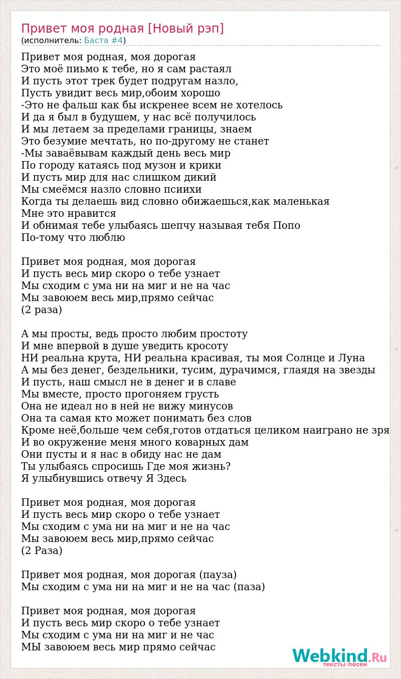 Привет моя родная, моя дорогая Это моё пиьмо к тебе, но я сам растаял И пусть этот трек будет подругам назло, Пусть увидит весь мир,обоим хорошо -Это не фальш как бы искренее всем не хотелось И да я был в будушем, у нас всё получилось И мы летаем за пределами границы, знаем Это безумие мечтать, но по-другому не станет -Мы заваёвывам каждый день весь мир По городу катаясь под музон и крики И пусть мир для нас слишком дикий Мы смеёмся назло словно псиихи Когда ты делаешь вид словно обижаешься,как маленькая Мне это нравится И обнимая тебе улыбаясь шепчу называя тебя Попо По-тому что люблю Привет моя родная, моя дорогая И пусть весь мир скоро о тебе узнает Мы сходим с ума ни на миг и не на час Мы завоюем весь мир,прямо сейчас (2 раза) А мы просты, ведь просто любим простоту И мне впервой в душе уведить кросоту НИ реальна крута, НИ реальна красивая, ты моя Солнце и Луна А мы без денег, бездельники, тусим, дурачимся, глаядя на звезды И пусть, наш смысл не в денег и в славе Мы вместе, просто прогоняем грусть Она не идеал но в ней не вижу минусов Она та самая кто может понимать без слов Кроме неё,больше чем себя,готов отдаться целиком наиграно не зря И во окружение меня много коварных дам Они пусты и я нас в обиду нас не дам Ты улыбаясь спросишь Где моя жизнь? Я улыбнувшись отвечу Я Здесь Привет моя родная, моя дорогая И пусть весь мир скоро о тебе узнает Мы сходим с ума ни на миг и не на час Мы завоюем весь мир,прямо сейчас (2 Раза) Привет моя родная, моя дорогая (пауза) Мы сходим с ума ни на миг и не на час (паза) Привет моя родная, моя дорогая И пусть весь мир скоро о тебе узнает Мы сходим с ума ни на миг и не час МЫ завоюем весь мир прямо сейчас