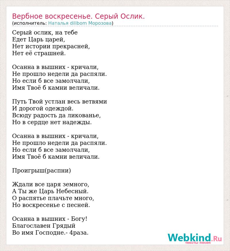 Серый ослик, на тебе Едет Царь царей, Нет истории прекрасней, Нет её страшней. Осанна в вышних - кричали, Не прошло недели да распяли. Но если б все замолчали, Имя Твоё б камни величали. Путь Твой устлан весь ветвями И дорогой одеждой. Всюду радость да ликованье, Но в сердце нет надежды. Осанна в вышних - кричали, Не прошло недели да распяли. Но если б все замолчали, Имя Твоё б камни величали. Проигрыш(распни) Ждали все царя земного, А Ты же Царь Небесный. О распятье плачьте много, Но воскресенье с песней. Осанна в вышних - Богу! Благославен Грядый Во имя Господне.- 4раза.