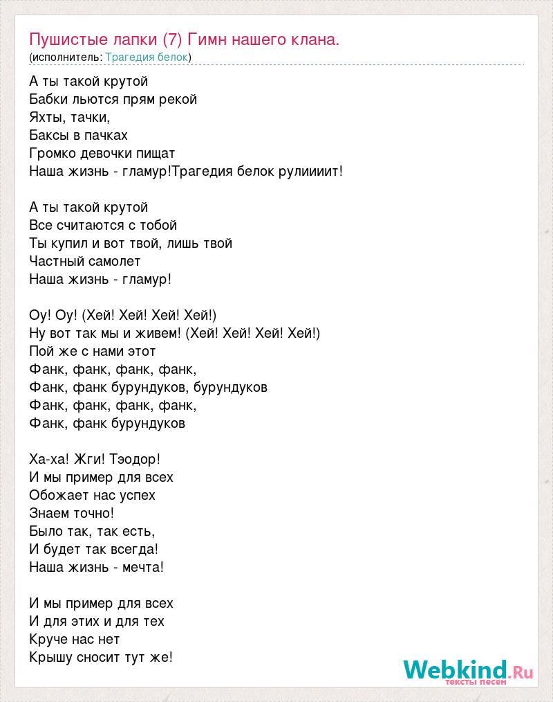 А ты такой крутой Бабки льются прям рекой Яхты, тачки, Баксы в пачках Громко девочки пищат Наша жизнь - гламур!Трагедия белок рулиииит! А ты такой крутой Все считаются с тобой Ты купил и вот твой, лишь твой Частный самолет Наша жизнь - гламур! Оу! Оу! (Хей! Хей! Хей! Хей!) Ну вот так мы и живем! (Хей! Хей! Хей! Хей!) Пой же с нами этот Фанк, фанк, фанк, фанк, Фанк, фанк бурундуков, бурундуков Фанк, фанк, фанк, фанк, Фанк, фанк бурундуков Ха-ха! Жги! Тэодор! И мы пример для всех Обожает нас успех Знаем точно! Было так, так есть, И будет так всегда! Наша жизнь - мечта! И мы пример для всех И для этих и для тех Круче нас нет Крышу сносит тут же!