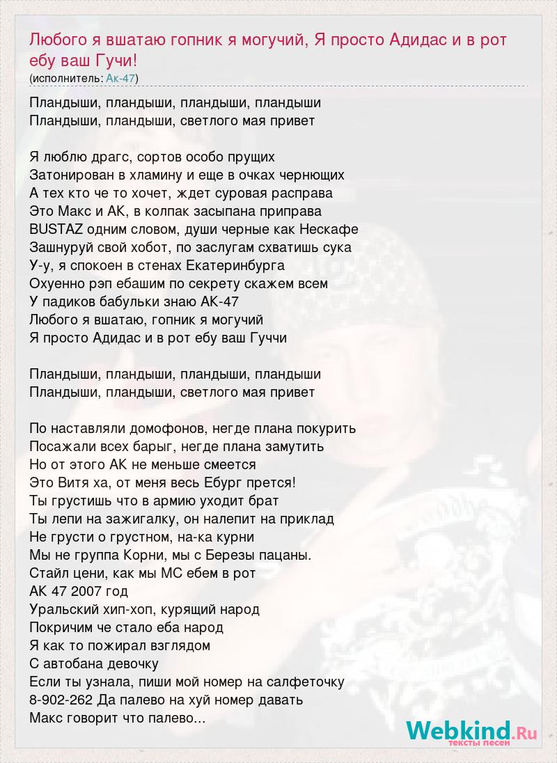 Пландыши, пландыши, пландыши, пландыши Пландыши, пландыши, светлого мая привет Я люблю драгс, сортов особо прущих Затонирован в хламину и еще в очках чернющих А тех кто че то хочет, ждет суровая расправа Это Макс и АК, в колпак засыпана приправа BUSTAZ одним словом, души черные как Нескафе Зашнуруй свой хобот, по заслугам схватишь сука У-у, я спокоен в стенах Екатеринбурга Охуенно рэп ебашим по секрету скажем всем У падиков бабульки знаю АК-47 Любого я вшатаю, гопник я могучий Я просто Адидас и в рот ебу ваш Гуччи Пландыши, пландыши, пландыши, пландыши Пландыши, пландыши, светлого мая привет По наставляли домофонов, негде плана покурить Посажали всех барыг, негде плана замутить Но от этого АК не меньше смеется Это Витя ха, от меня весь Ебург прется! Ты грустишь что в армию уходит брат Ты лепи на зажигалку, он налепит на приклад Не грусти о грустном, на-ка курни Мы не группа Корни, мы с Березы пацаны. Стайл цени, как мы МС ебем в рот АК 47 2007 год Уральский хип-хоп, курящий народ Покричим че стало еба народ Я как то пожирал взглядом С автобана девочку Если ты узнала, пиши мой номер на салфеточку 8-902-262 Да палево на хуй номер давать Макс говорит что палево...
