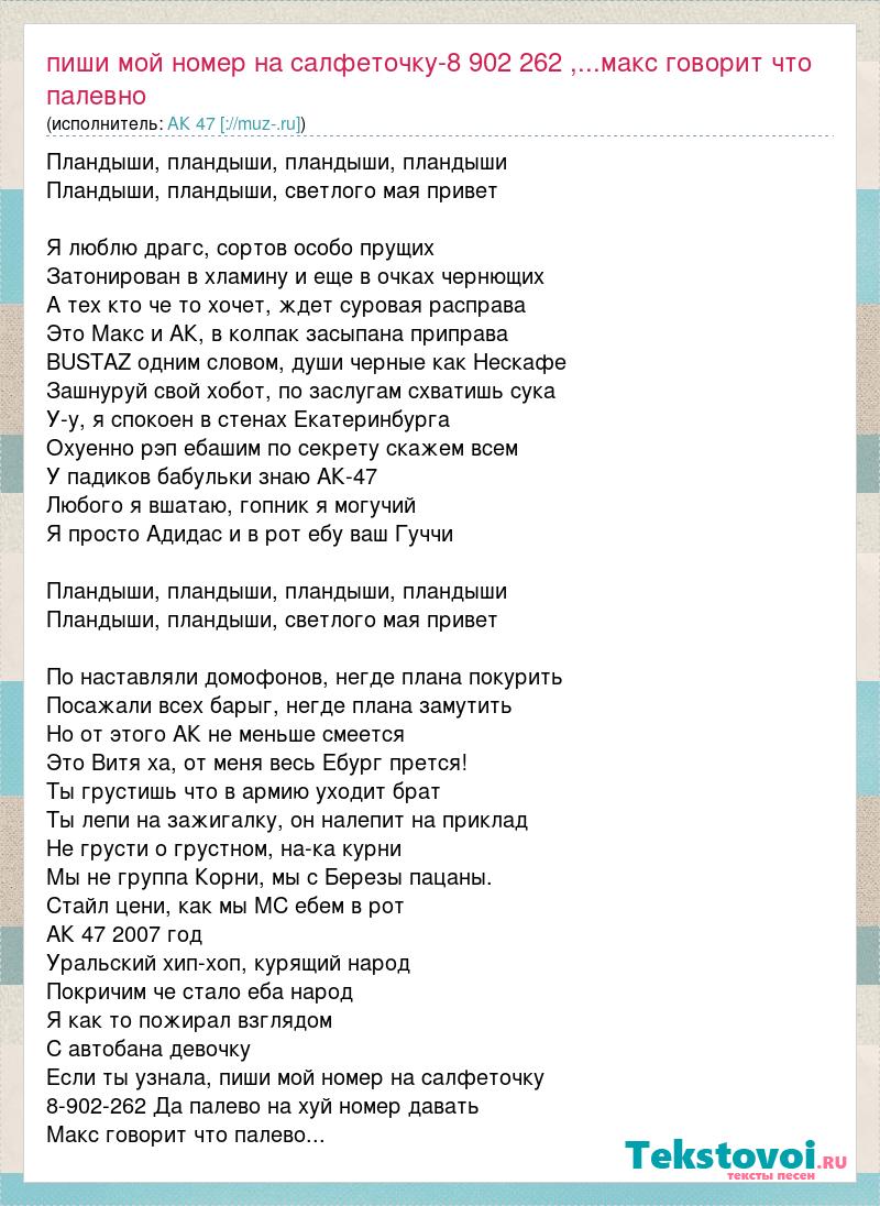 Пландыши, пландыши, пландыши, пландыши Пландыши, пландыши, светлого мая привет Я люблю драгс, сортов особо прущих Затонирован в хламину и еще в очках чернющих А тех кто че то хочет, ждет суровая расправа Это Макс и АК, в колпак засыпана приправа BUSTAZ одним словом, души черные как Нескафе Зашнуруй свой хобот, по заслугам схватишь сука У-у, я спокоен в стенах Екатеринбурга Охуенно рэп ебашим по секрету скажем всем У падиков бабульки знаю АК-47 Любого я вшатаю, гопник я могучий Я просто Адидас и в рот ебу ваш Гуччи Пландыши, пландыши, пландыши, пландыши Пландыши, пландыши, светлого мая привет По наставляли домофонов, негде плана покурить Посажали всех барыг, негде плана замутить Но от этого АК не меньше смеется Это Витя ха, от меня весь Ебург прется! Ты грустишь что в армию уходит брат Ты лепи на зажигалку, он налепит на приклад Не грусти о грустном, на-ка курни Мы не группа Корни, мы с Березы пацаны. Стайл цени, как мы МС ебем в рот АК 47 2007 год Уральский хип-хоп, курящий народ Покричим че стало еба народ Я как то пожирал взглядом С автобана девочку Если ты узнала, пиши мой номер на салфеточку 8-902-262 Да палево на хуй номер давать Макс говорит что палево...