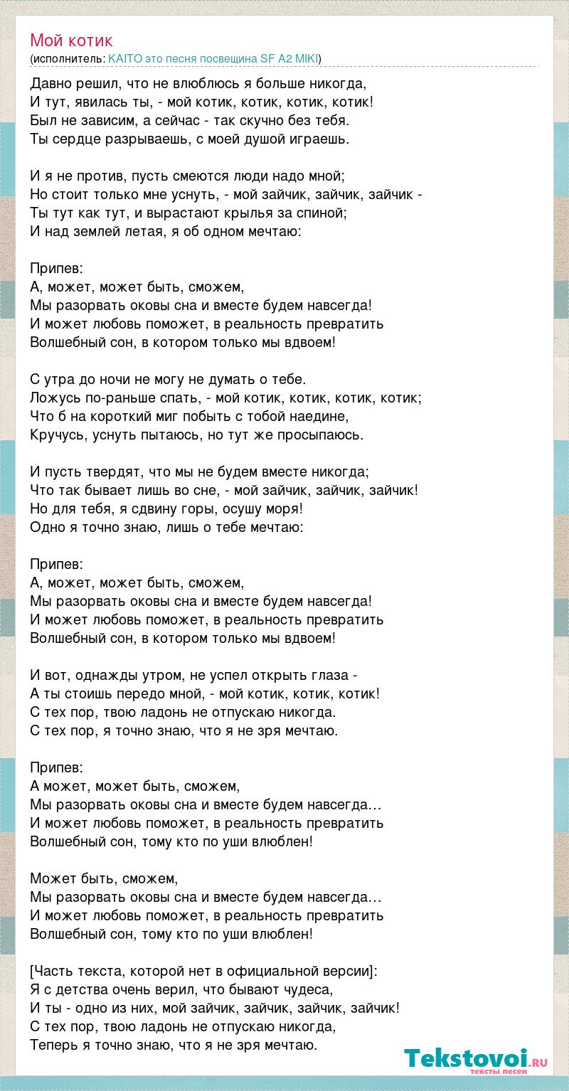 Давно решил, что не влюблюсь я больше никогда, И тут, явилась ты, - мой котик, котик, котик, котик! Был не зависим, а сейчас - так скучно без тебя. Ты сердце разрываешь, с моей душой играешь. И я не против, пусть смеются люди надо мной; Но стоит только мне уснуть, - мой зайчик, зайчик, зайчик - Ты тут как тут, и вырастают крылья за спиной; И над землей летая, я об одном мечтаю: Припев: А, может, может быть, сможем, Мы разорвать оковы сна и вместе будем навсегда! И может любовь поможет, в реальность превратить Волшебный сон, в котором только мы вдвоем! С утра до ночи не могу не думать о тебе. Ложусь по-раньше спать, - мой котик, котик, котик, котик; Что б на короткий миг побыть с тобой наедине, Кручусь, уснуть пытаюсь, но тут же просыпаюсь. И пусть твердят, что мы не будем вместе никогда; Что так бывает лишь во сне, - мой зайчик, зайчик, зайчик! Но для тебя, я сдвину горы, осушу моря! Одно я точно знаю, лишь о тебе мечтаю: Припев: А, может, может быть, сможем, Мы разорвать оковы сна и вместе будем навсегда! И может любовь поможет, в реальность превратить Волшебный сон, в котором только мы вдвоем! И вот, однажды утром, не успел открыть глаза - А ты стоишь передо мной, - мой котик, котик, котик! С тех пор, твою ладонь не отпускаю никогда. С тех пор, я точно знаю, что я не зря мечтаю. Припев: А может, может быть, сможем, Мы разорвать оковы сна и вместе будем навсегда… И может любовь поможет, в реальность превратить Волшебный сон, тому кто по уши влюблен! Может быть, сможем, Мы разорвать оковы сна и вместе будем навсегда… И может любовь поможет, в реальность превратить Волшебный сон, тому кто по уши влюблен! [Часть текста, которой нет в официальной версии]: Я с детства очень верил, что бывают чудеса, И ты - одно из них, мой зайчик, зайчик, зайчик, зайчик! С тех пор, твою ладонь не отпускаю никогда, Теперь я точно знаю, что я не зря мечтаю.