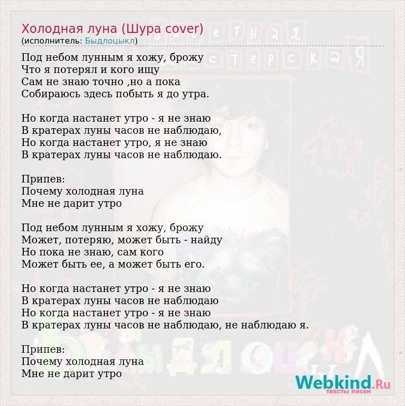 Под небом лунным я хожу, брожу Что я потерял и кого ищу Сам не знаю точно ,но а пока Собираюсь здесь побыть я до утра. Но когда настанет утро - я не знаю В кратерах луны часов не наблюдаю, Но когда настанет утро, я не знаю В кратерах луны часов не наблюдаю. Припев: Почему холодная луна Мне не дарит утро Под небом лунным я хожу, брожу Может, потеряю, может быть - найду Но пока не знаю, сам кого Может быть ее, а может быть его. Но когда настанет утро - я не знаю В кратерах луны часов не наблюдаю Но когда настанет утро - я не знаю В кратерах луны часов не наблюдаю, не наблюдаю я. Припев: Почему холодная луна Мне не дарит утро