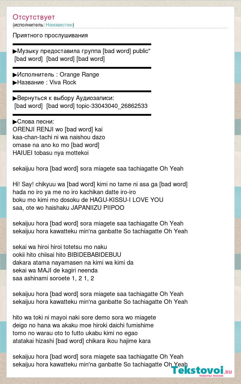 Приятного прослушивания ▬▬▬▬▬▬▬▬▬▬▬▬▬▬▬▬▬▬▬▬▬▬▬ ▶Музыку предоставила группа "NARUTO public" [bad word] [bad word] lllnarutolllpubliclll ▬▬▬▬▬▬▬▬▬▬▬▬▬▬▬▬▬▬▬▬▬▬▬ ▶Исполнитель : Orange Range ▶Название : Viva Rock ▬▬▬▬▬▬▬▬▬▬▬▬▬▬▬▬▬▬▬▬▬▬▬ ▶Вернуться к выбору Аудиозаписи: [bad word] [bad word] topic-33043040_26862533 ▬▬▬▬▬▬▬▬▬▬▬▬▬▬▬▬▬▬▬▬▬▬▬ ▶Слова песни: ORENJI RENJI wo shitteru kai kaa-chan-tachi ni wa naishou dazo omase na ano ko mo kiiteruze HAIUEI tobasu nya mottekoi sekaijuu hora waratteru sora miagete saa tachiagatte Oh Yeah Hi! Say! chikyuu wa mawaru kimi no tame ni asa ga kuru hada no iro ya me no iro kachikan datte iro-iro boku mo kimi mo dosoku de HAGU-KISSU-I LOVE YOU saa, ote wo haishaku JAPANIIZU PIIPOO sekaijuu hora waratteru sora miagete saa tachiagatte Oh Yeah sekaijuu hora kawatteku min'na ganbatte So tachiagatte Oh Yeah sekai wa hiroi hiroi totetsu mo naku ookii hito chiisai hito BIBIDEBABIDEBUU dakara atama nayamasen na kimi wa kimi da sekai wa MAJI de kagiri neenda saa ashinami soroete 1, 2 1, 2 sekaijuu hora waratteru sora miagete saa tachiagatte Oh Yeah sekaijuu hora kawatteku min'na ganbatte So tachiagatte Oh Yeah hito wa toki ni mayoi naki sore demo sora wo miagete deigo no hana wa akaku moe hiroki daichi fumishime tomo no warau oto to futto ukabu kimi no egao atatakai hizashi maioriru chikara ikou hajime kara sekaijuu hora waratteru sora miagete saa tachiagatte Oh Yeah sekaijuu hora kawatteku min'na ganbatte So tachiagatte Oh Yeah