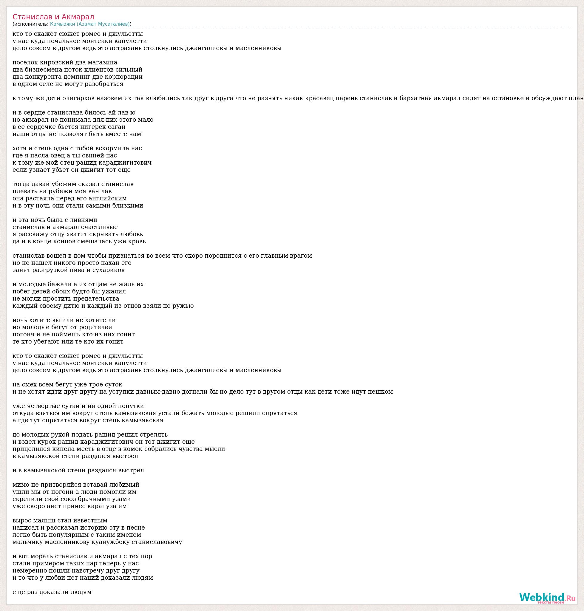 кто-то скажет сюжет ромео и джульетты у нас куда печальнее монтекки капулетти дело совсем в другом ведь это астрахань столкнулись джангалиевы и масленниковы поселок кировский два магазина два бизнесмена поток клиентов сильный два конкурента демпинг две корпорации в одном селе не могут разобраться к тому же дети олигархов назовем их так влюбились так друг в друга что не разнять никак красавец парень станислав и бархатная акмарал сидят на остановке и обсуждают план и в сердце станислава билось ай лав ю но акмарал не понимала для них этого мало в ее сердечке бьется нигерек саган наши отцы не позволят быть вместе нам хотя и степь одна с тобой вскормила нас где я пасла овец а ты свиней пас к тому же мой отец рашид караджигитович если узнает убьет он джигит тот еще тогда давай убежим сказал станислав плевать на рубежи моя ван лав она растаяла перед его английским и в эту ночь они стали самыми близкими и эта ночь была с ливнями станислав и акмарал счастливые я расскажу отцу хватит скрывать любовь да и в конце концов смешалась уже кровь станислав вошел в дом чтобы признаться во всем что скоро породнится с его главным врагом но не нашел никого просто пахан его занят разгрузкой пива и сухариков и молодые бежали а их отцам не жаль их побег детей обоих будто бы ужалил не могли простить предательства каждый своему дитю и каждый из отцов взяли по ружью ночь хотите вы или не хотите ли но молодые бегут от родителей погоня и не поймешь кто из них гонит те кто убегают или те кто их гонит кто-то скажет сюжет ромео и джульетты у нас куда печальнее монтекки капулетти дело совсем в другом ведь это астрахань столкнулись джангалиевы и масленниковы на смех всем бегут уже трое суток и не хотят идти друг другу на уступки давным-давно догнали бы но дело тут в другом отцы как дети тоже идут пешком уже четвертые сутки и ни одной попутки откуда взяться им вокруг степь камызякская устали бежать молодые решили спрятаться а где тут спрятаться вокруг степь камызякская до молодых рукой подать рашид решил стрелять и взвел курок рашид караджигитович он тот джигит еще прицелился кипела месть в отце в комок собрались чувства мысли в камызякской степи раздался выстрел и в камызякской степи раздался выстрел мимо не притворяйся вставай любимый ушли мы от погони а люди помогли им скрепили свой союз брачными узами уже скоро аист принес карапуза им вырос малыш стал известным написал и рассказал историю эту в песне легко быть популярным с таким именем мальчику масленникову куанужбеку станиславовичу и вот мораль станислав и акмарал с тех пор стали примером таких пар теперь у нас немеренно пошли навстречу друг другу и то что у любви нет наций доказали людям еще раз доказали людям